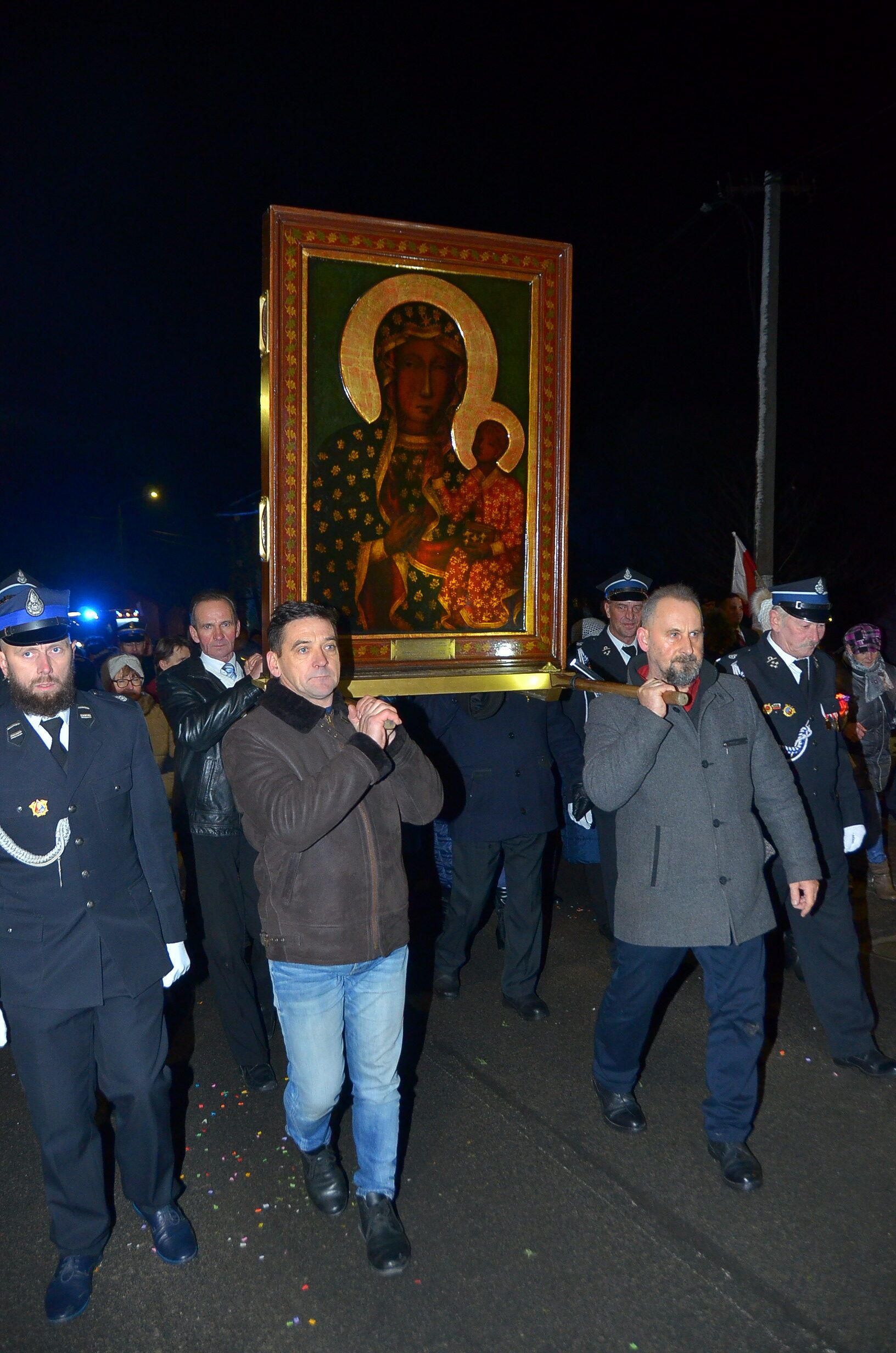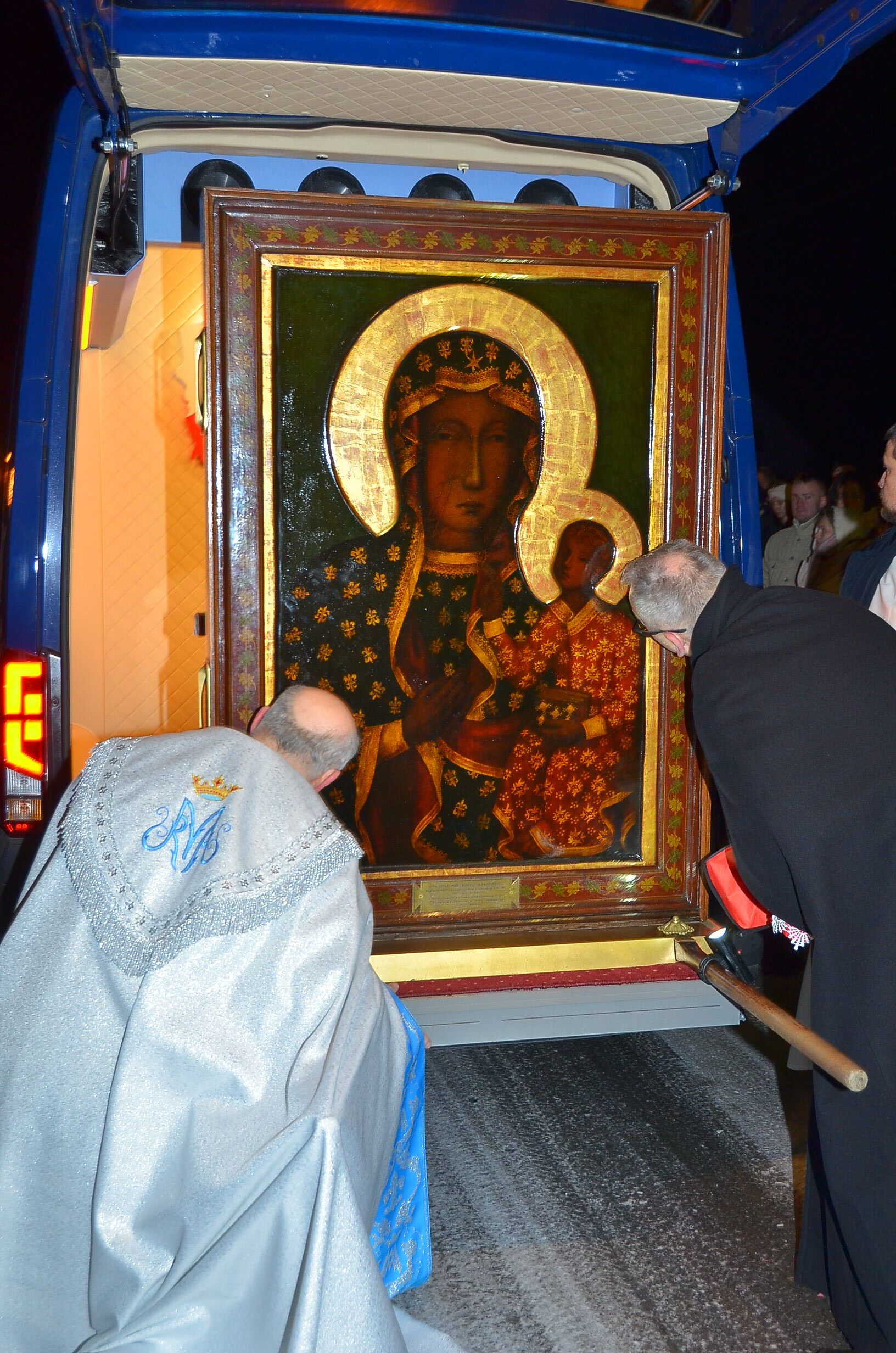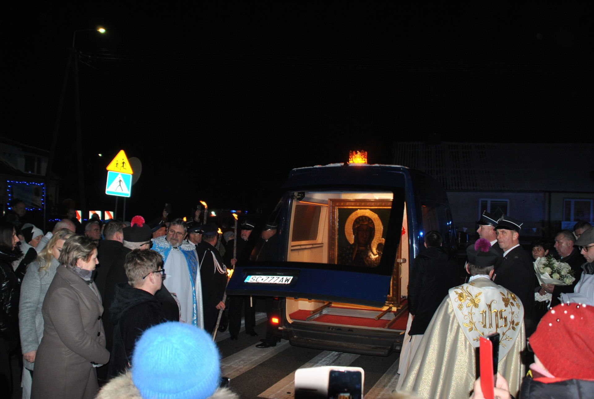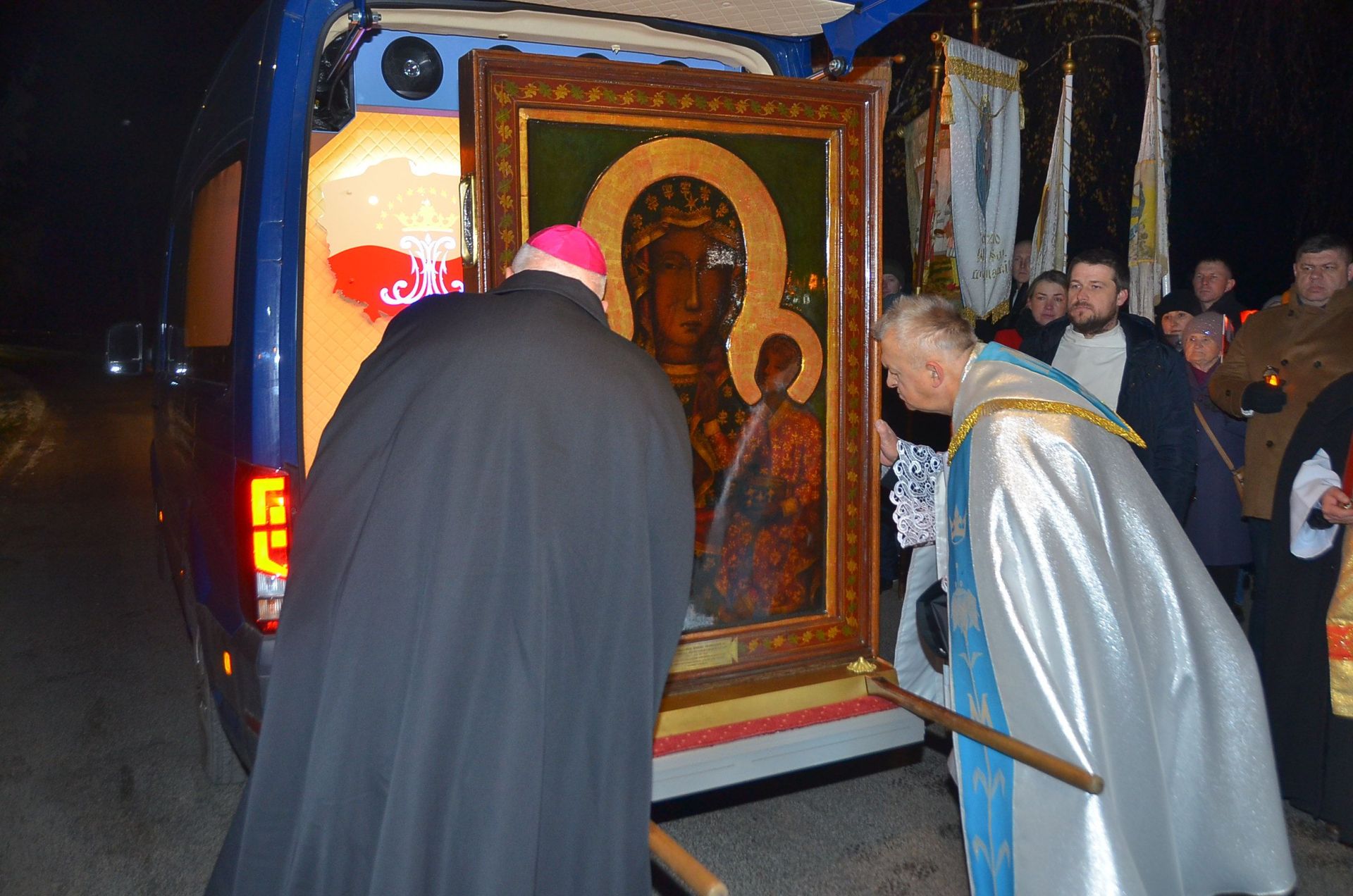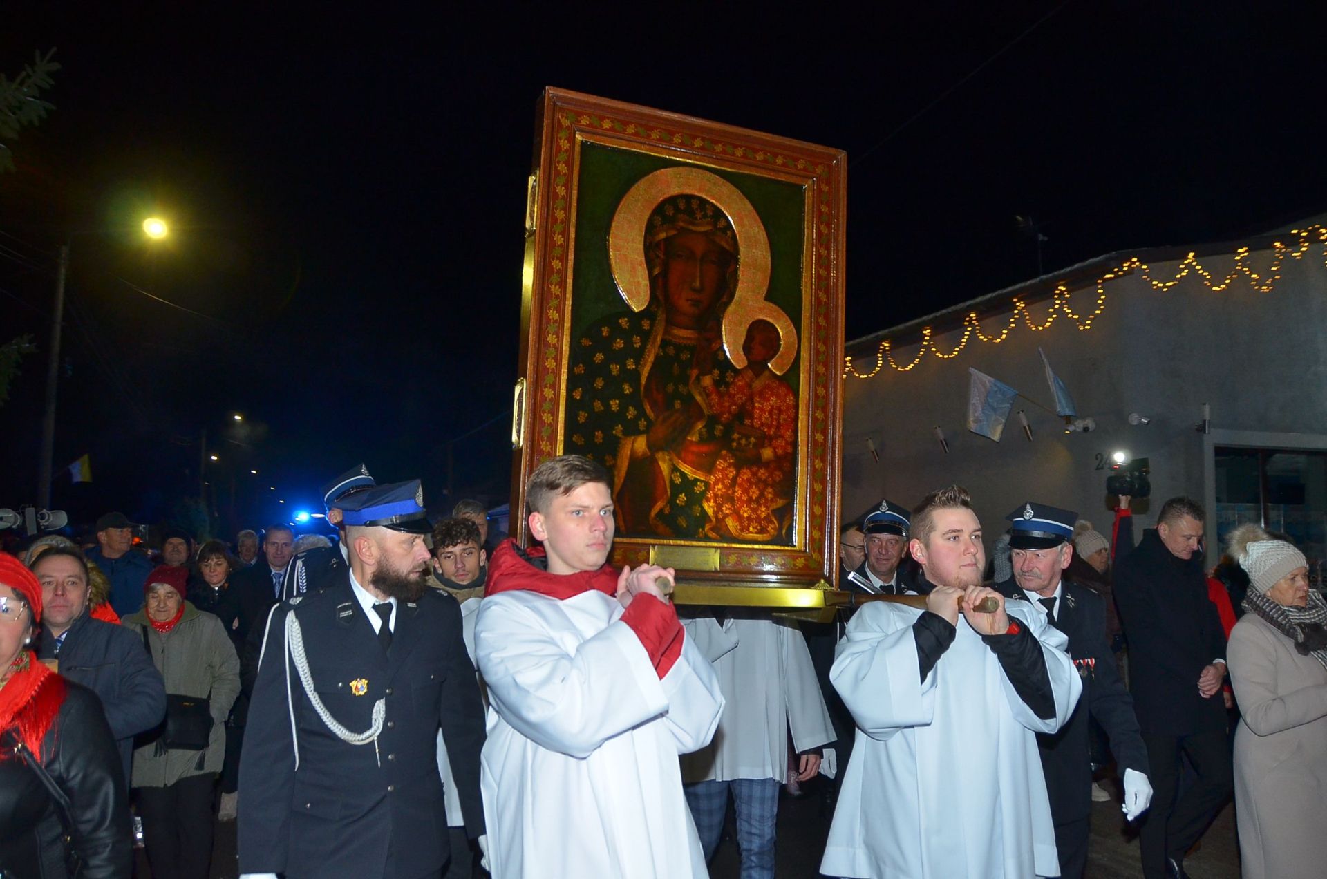 O godz. 17:30 Matka Boża przybyła do nas z parafii Ciepień. Po fanfarach, ucałowaniu Ikony Jasnogórskiej przez księdza proboszcza Andrzeja Minko i księdza dziekana Krzysztofa Graczyka, została ona wprowadzona do kościoła, niesiona przez strażaków, a wcześniej przez ojców i matki z parafii.