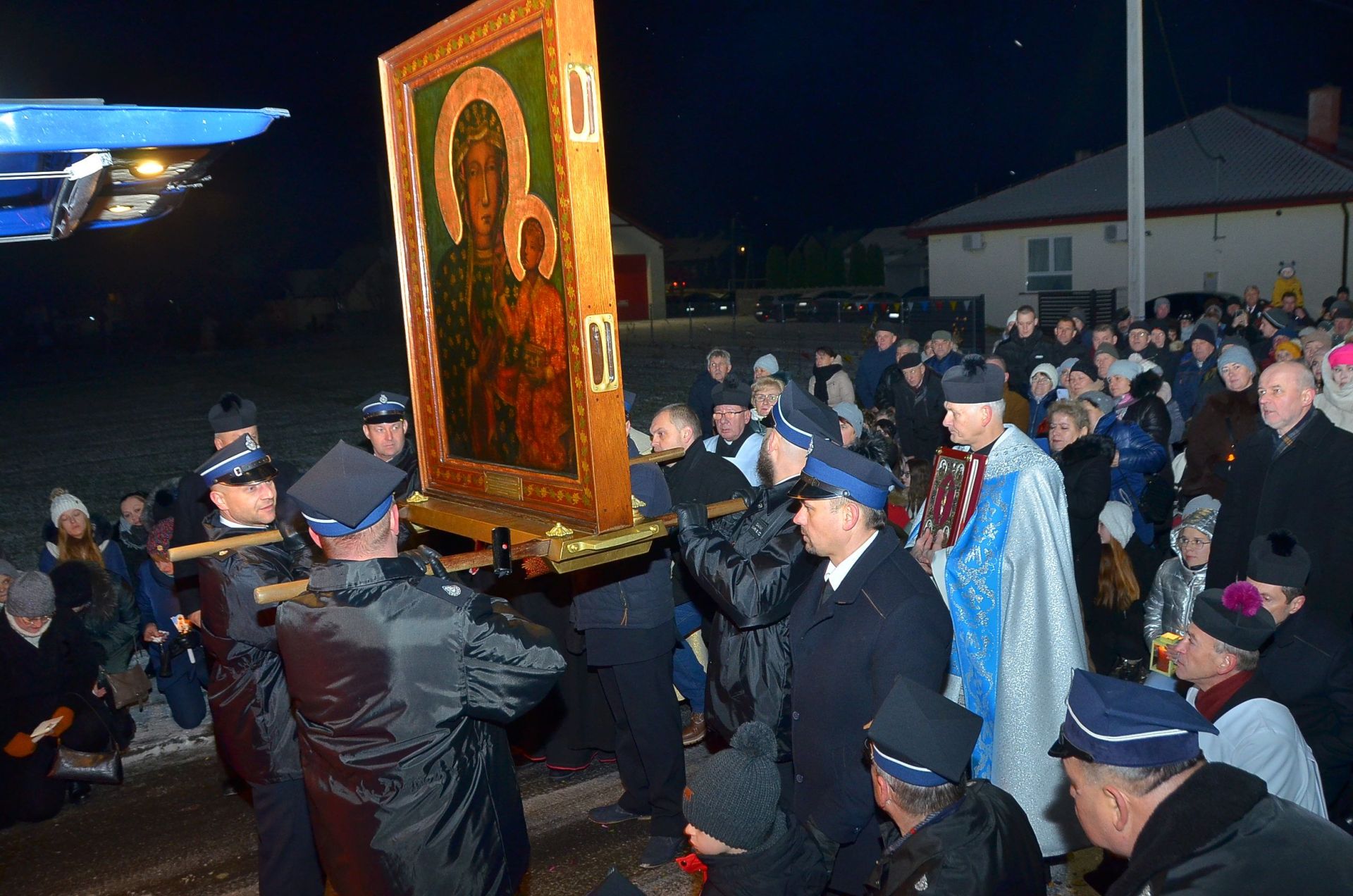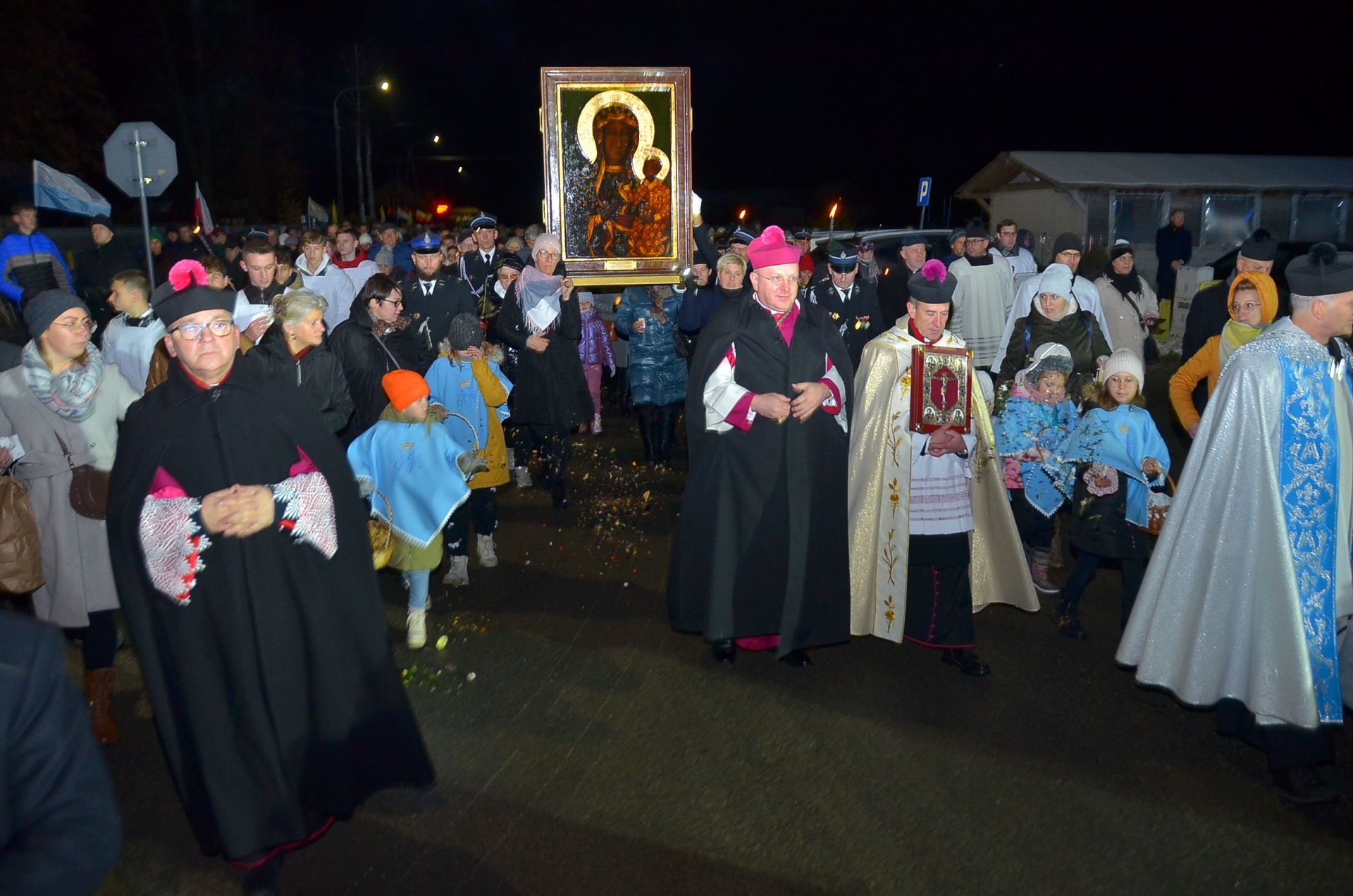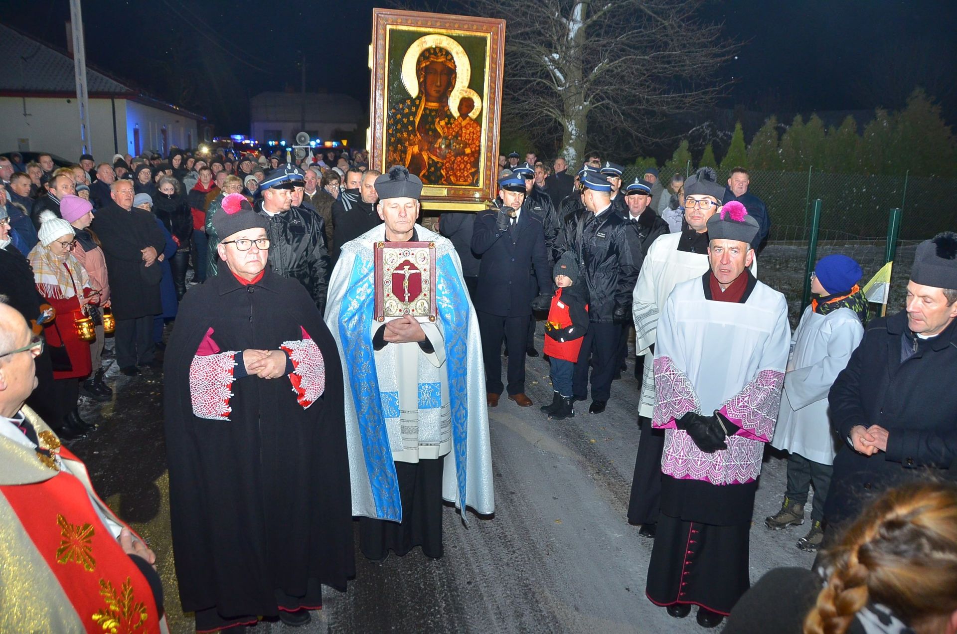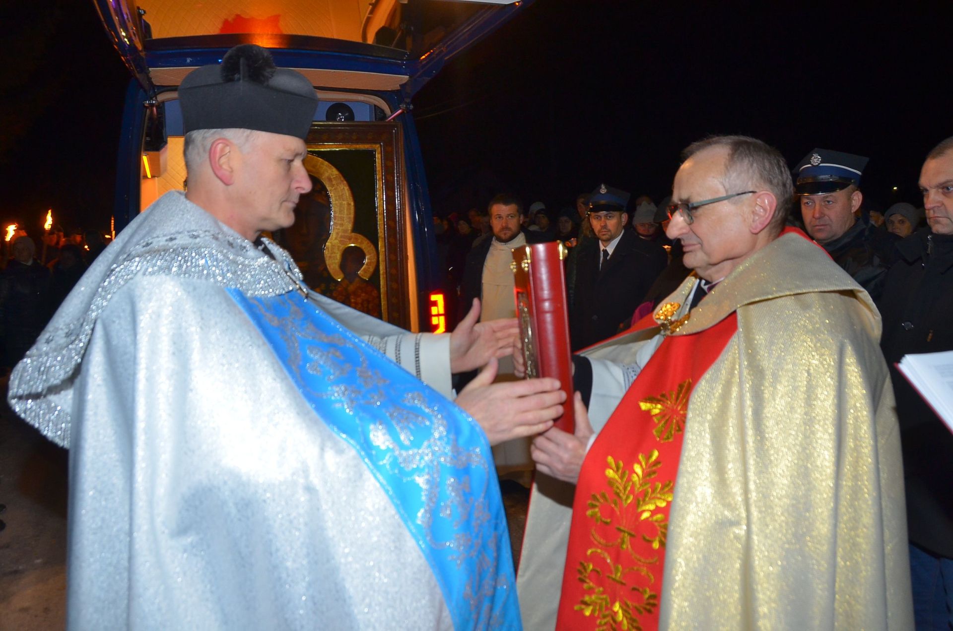 O godz. 17:30 Matka Boża przybyła do nas z parafii Ciepień. Po fanfarach, ucałowaniu Ikony Jasnogórskiej przez księdza proboszcza Andrzeja Minko i księdza dziekana Krzysztofa Graczyka, została ona wprowadzona do kościoła, niesiona przez strażaków, a wcześniej przez ojców i matki z parafii.