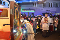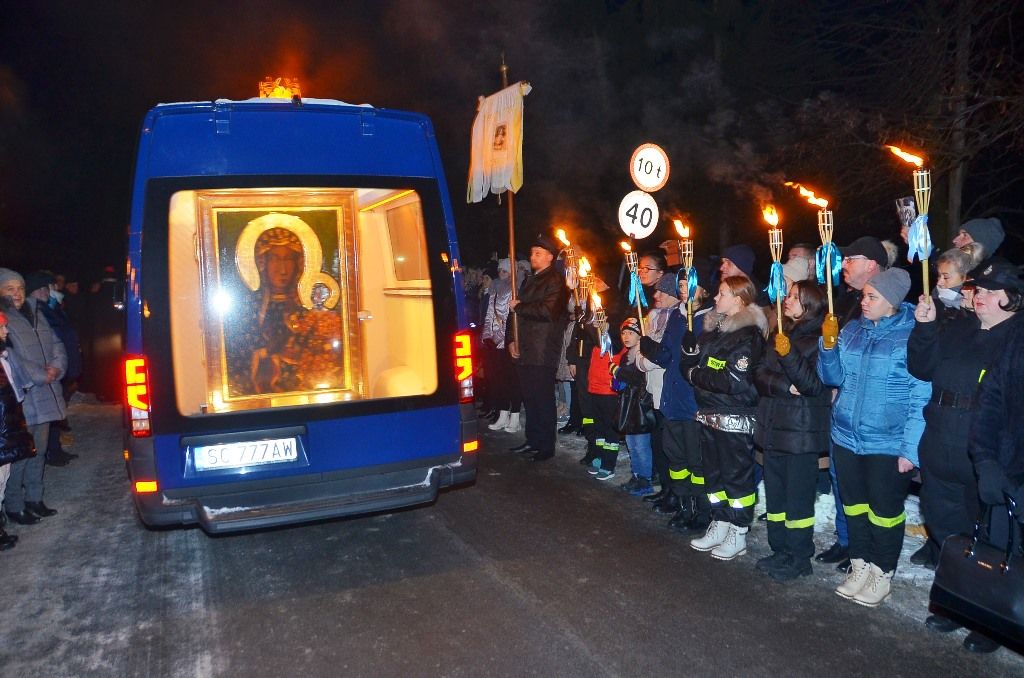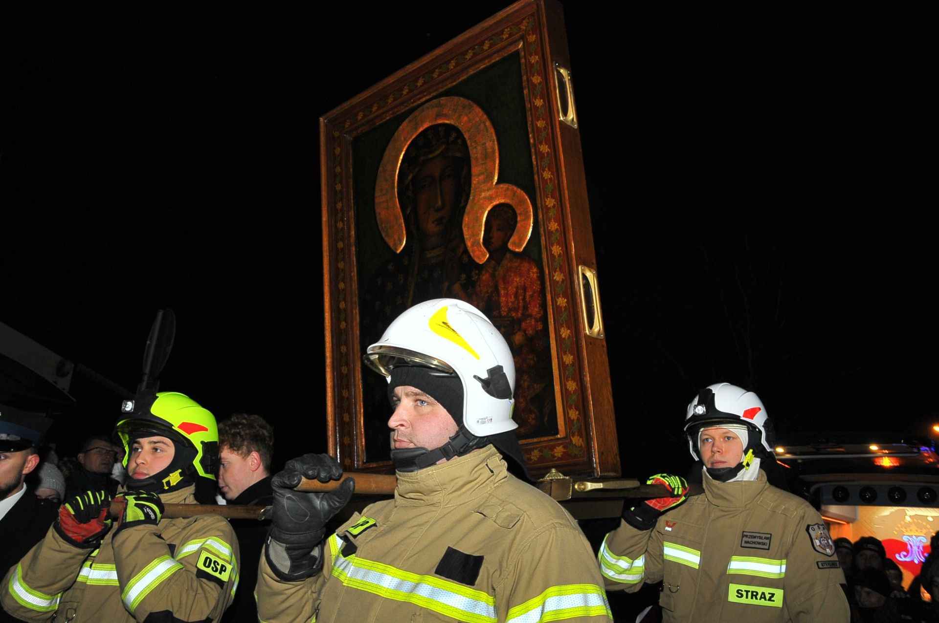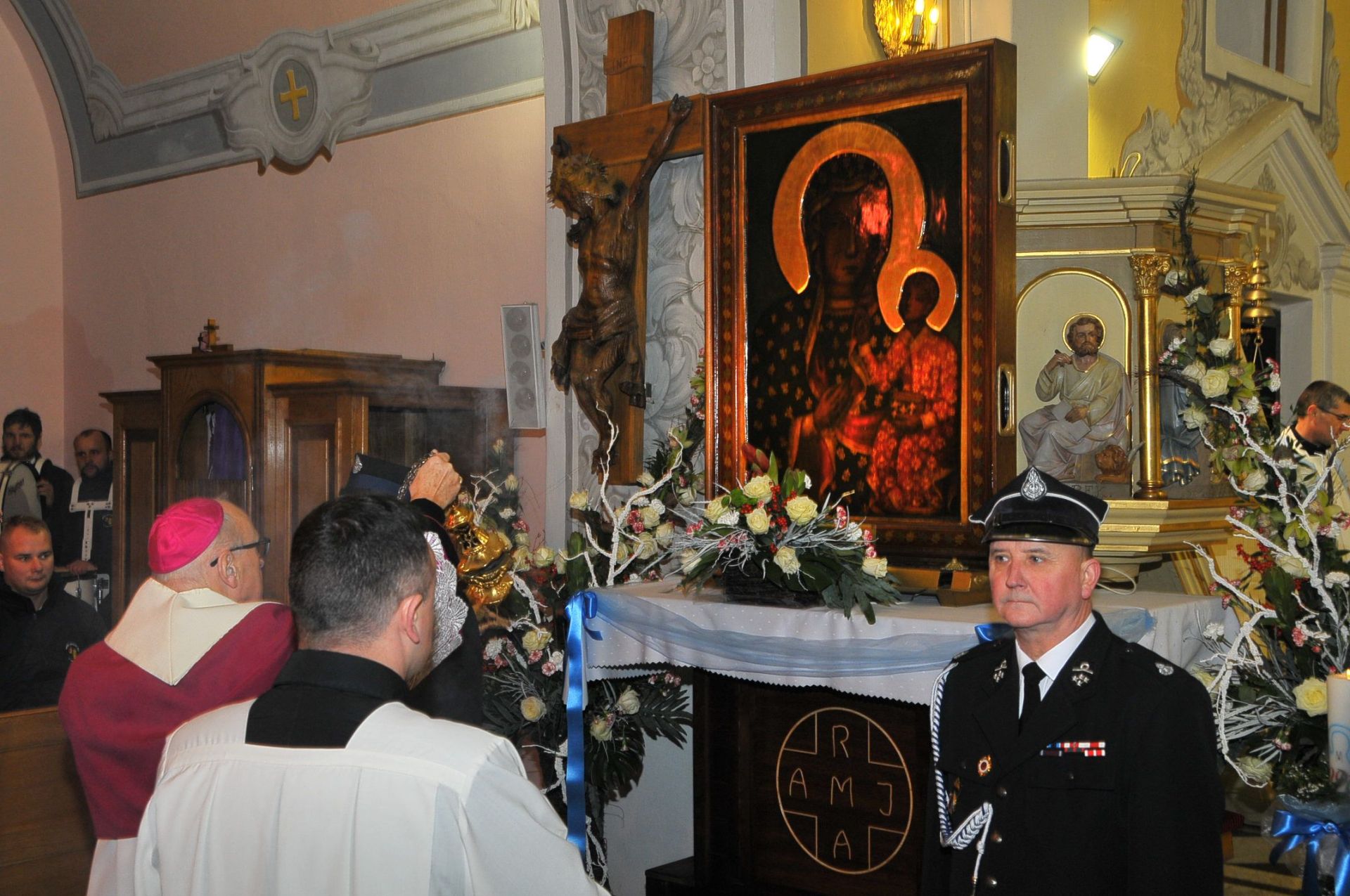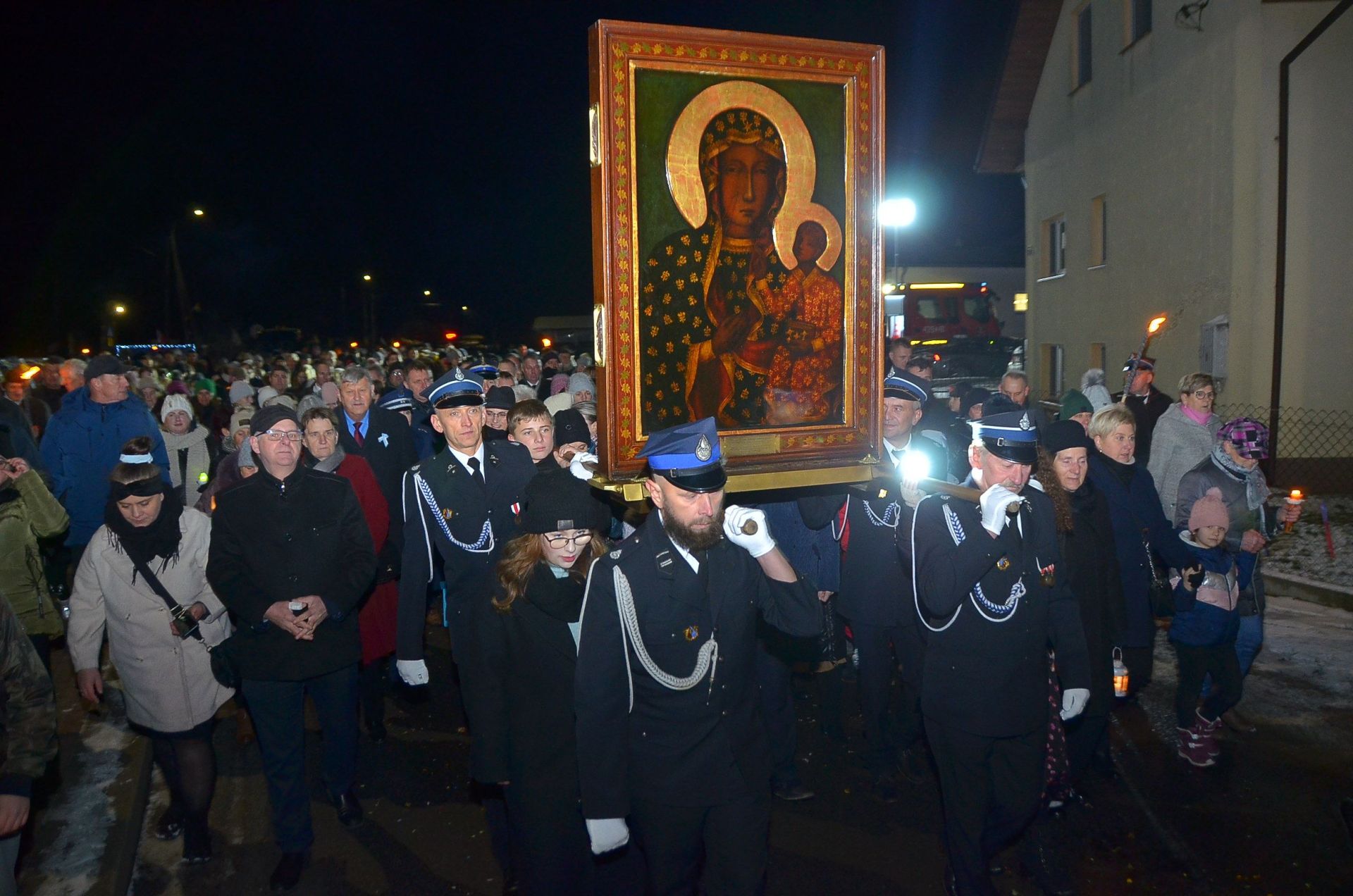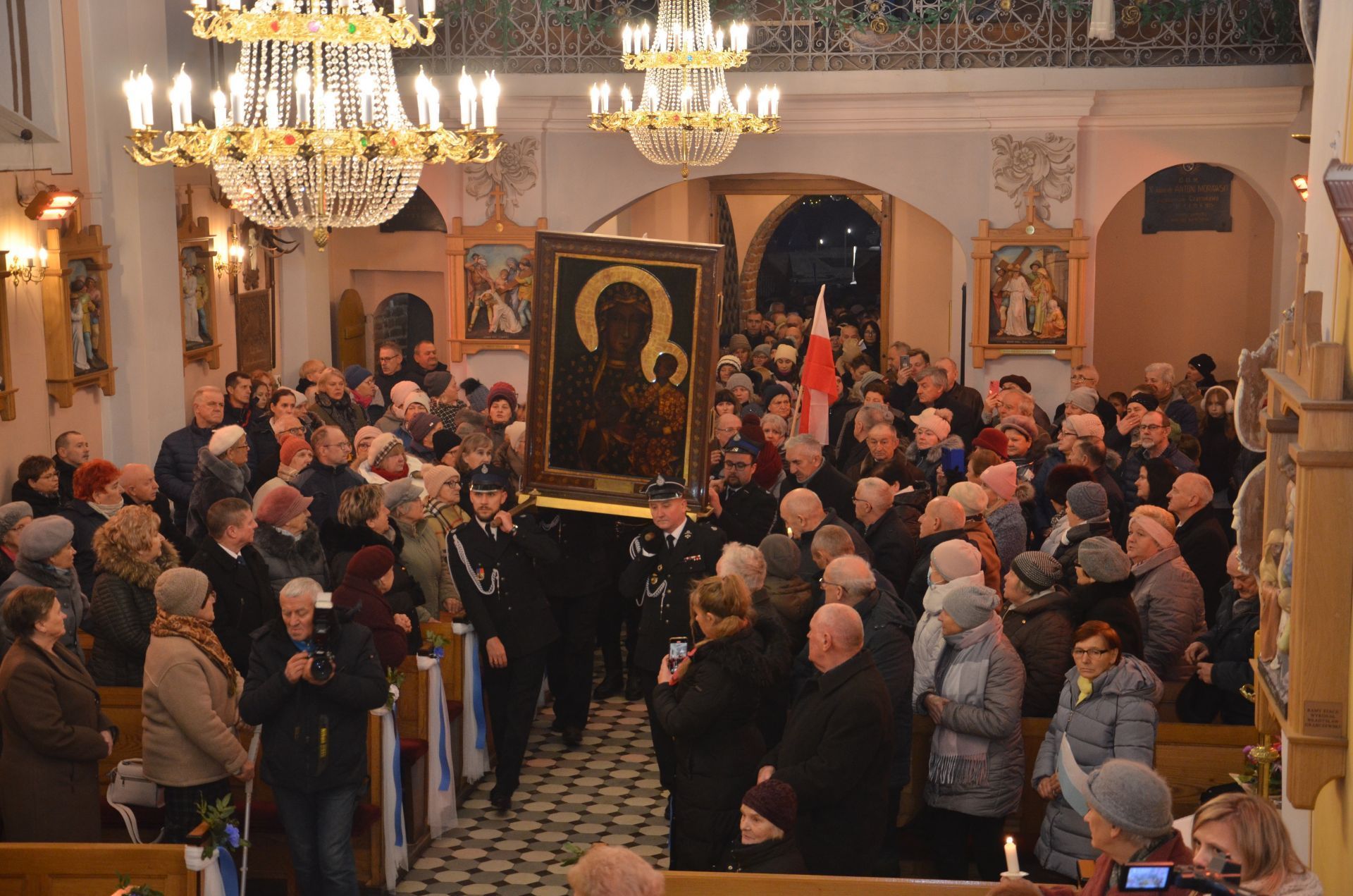 O godz. 17:30 Matka Boża przybyła do nas z parafii Ciepień. Po fanfarach, ucałowaniu Ikony Jasnogórskiej przez księdza proboszcza Andrzeja Minko i księdza dziekana Krzysztofa Graczyka, została ona wprowadzona do kościoła, niesiona przez strażaków, a wcześniej przez ojców i matki z parafii.