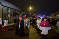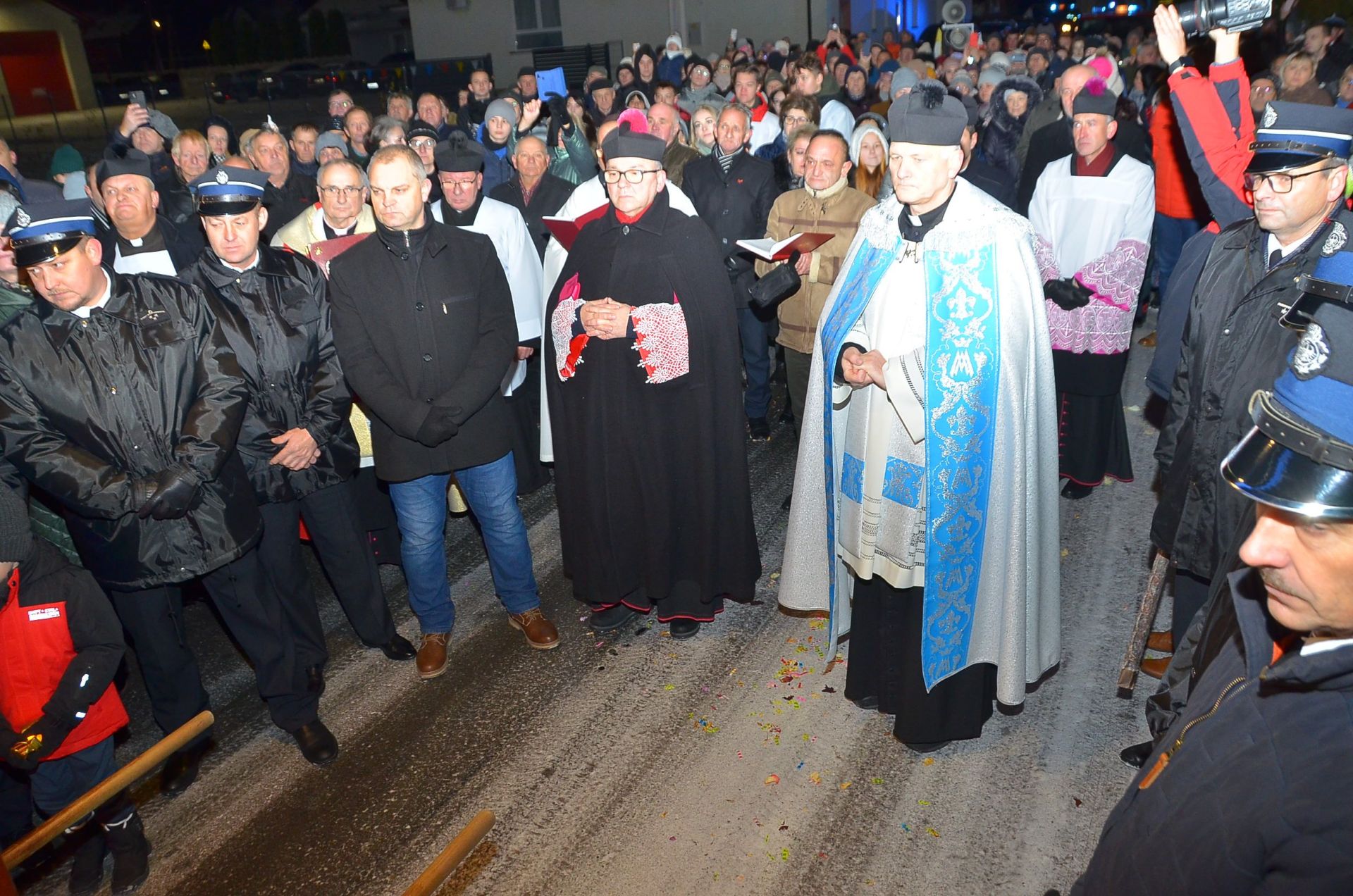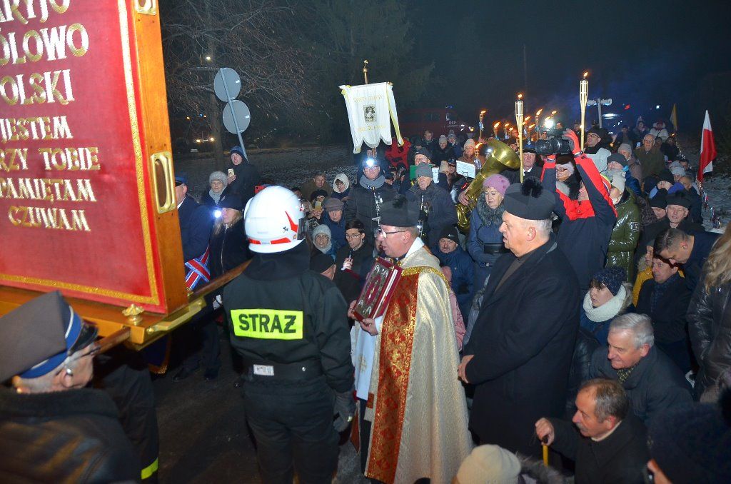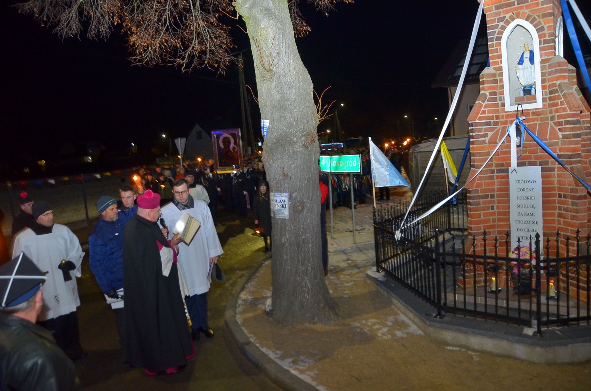 w obecności Księdza Biskupa Krzysztofa Wętkowskiego oraz ojca rekolekcjonisty Piotra Słomińskiego. Powitanie obrazu poprzedziła modlitwa różańcowa oraz poświęcenie przez Księdza Biskupa odnowionej kapliczki, które będzie przypominać nam o tym szczególnym czasie odwiedzin Matki. Następnie wyruszyliśmy w uroczystej procesji do naszej świątyni. Modlitwy prowadził Janusz Przychodny – kleryk WSD we Włocławku, pochodzący z naszej parafii. Obraz Jasnogórskiej Matki niosło 12 grup stanowych: druhowie Strażacy z terenu całej Parafii, matki, ojcowie, koła żywej róży, asysta kościelna, ministranci, młodzież, przedstawiciele władz lokalnych, zaproszeni goście (parlamentarzyści, przedstawiciel Rady Ministrów, Komendanci Powiatowi PSP oraz Policji), nauczyciele, chętni parafianie. Grup było dużo, gdyż to czas szczególnej łaski, który zdarza się raz na niemalże 50 lat. Uroczystej Mszy świętej powitania Matki Bożej przewodniczył Ks. Krzysztof Wętkowski – Biskup Włocławski.