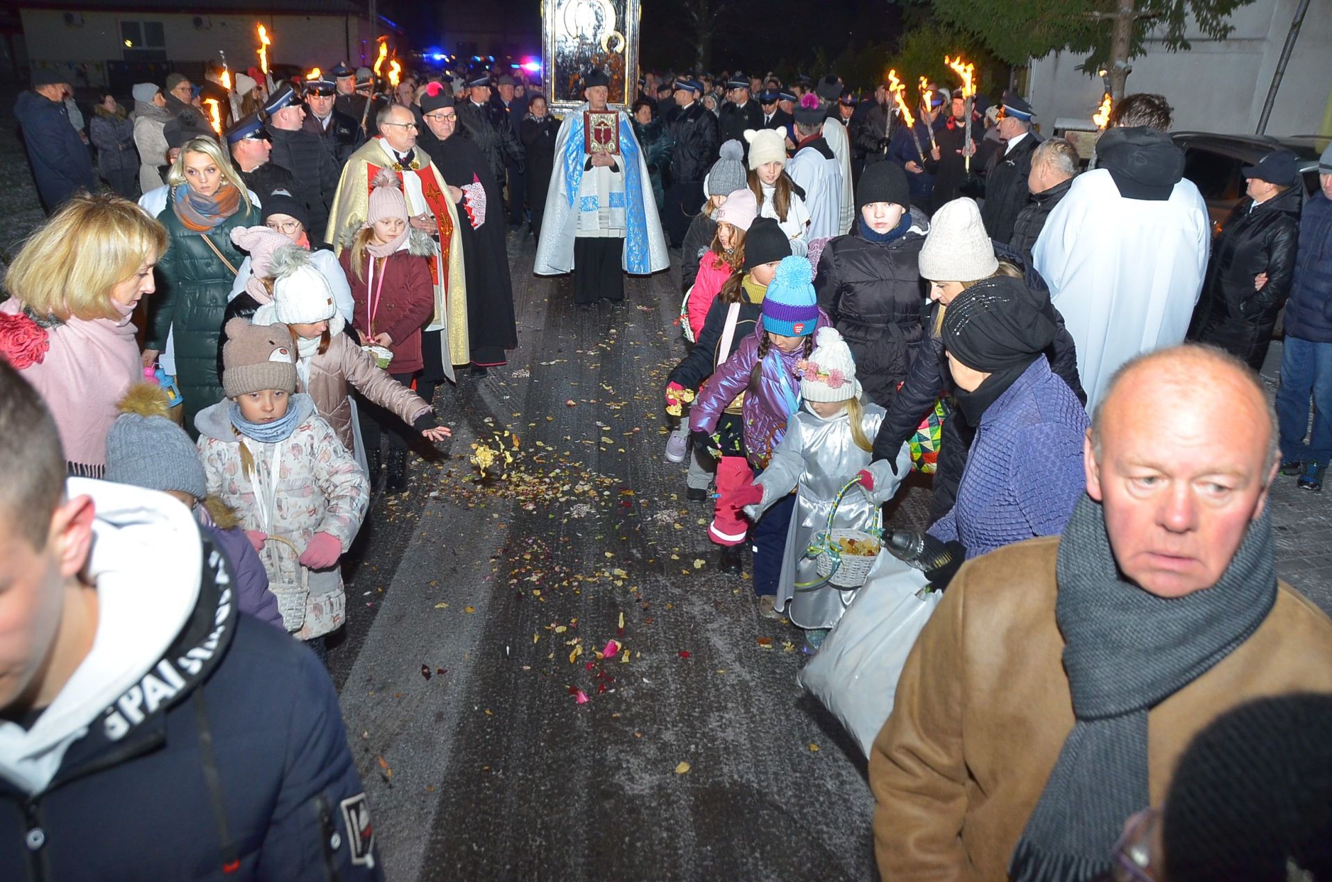 Po powitaniu obraz Matki Bożej był niesiony w procesji przez przedstawicieli parafii: ojców, matki, służbę liturgiczną, rodzinę zastępczą, nauczycieli, młodzież żeńską i męską, koła różańcowe i strażaków. Po uroczystym powitaniu w kościele Eucharystii przewodniczył