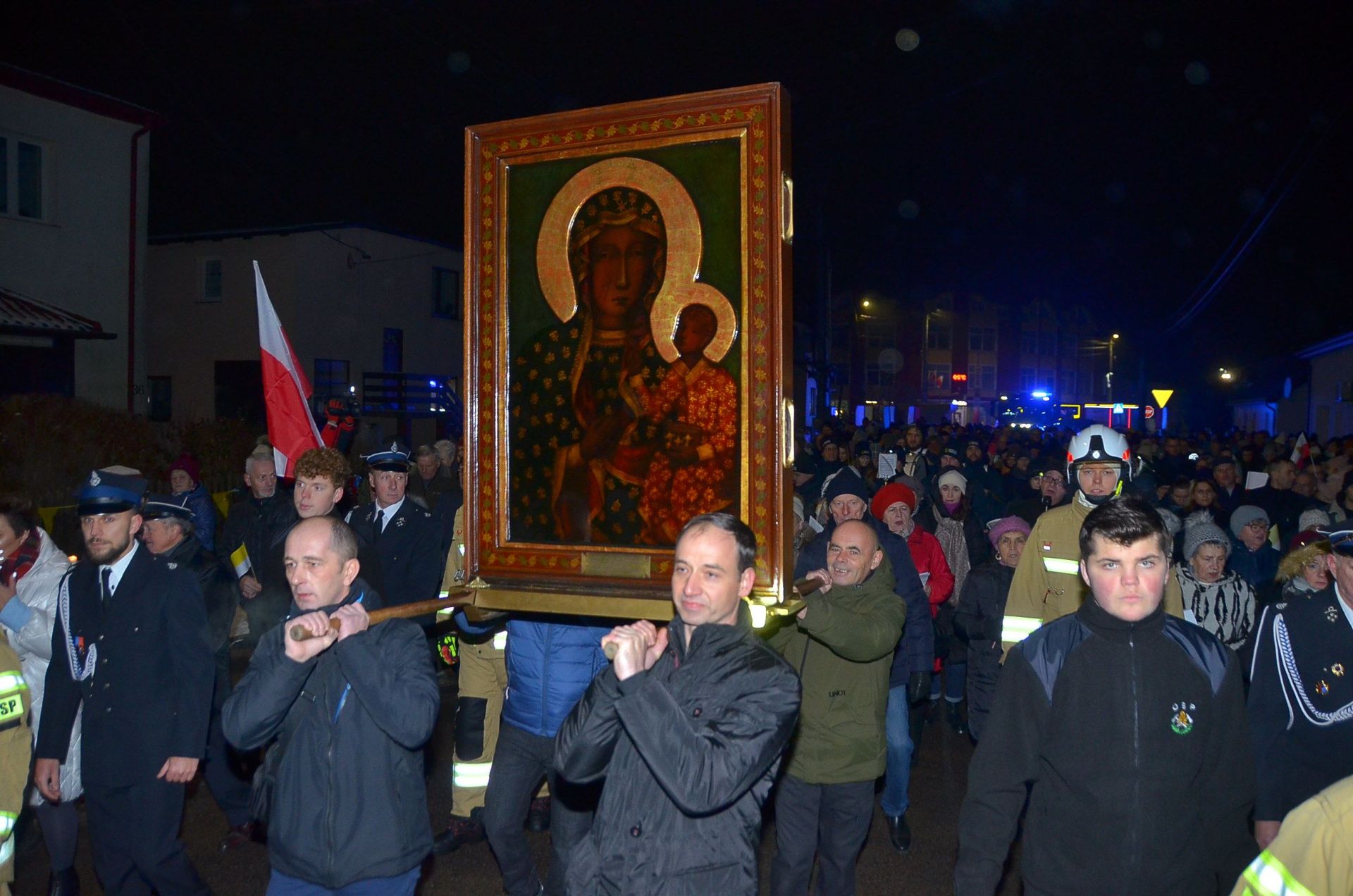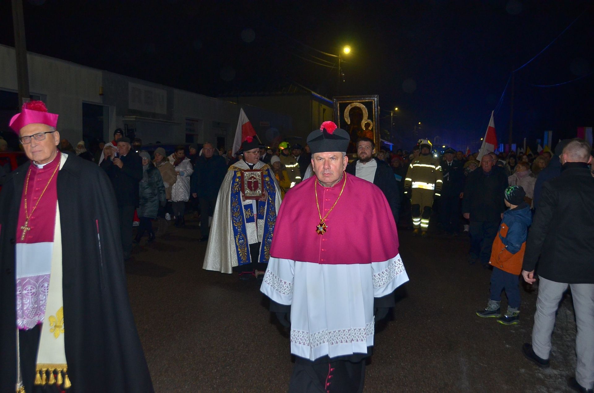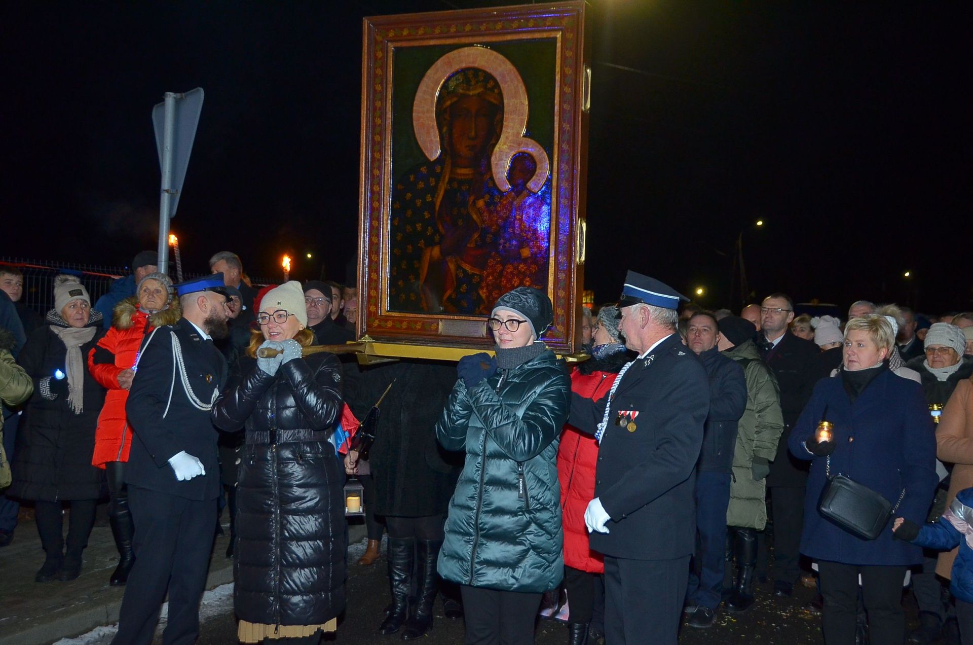 2 grudnia 2023 r. o godzinie 17.30 Matka Boża w znaku Ikony Jasnogórskiej, w asyście straży pożarnych przybyła do nas z parafii Trutowo. Po fanfarach odegranych przez naszą orkiestrę strażacką ksiądz dziekan ucałował ramy obrazu, przejął Ewangeliarz od ojca proboszcza z Trutowa i w uroczystej procesji ul. Słowackiego i ul.3-go Maja udaliśmy się do naszej świątyni parafialnej, przed którą dołączył do nas ks. bp Wiesław Alojzy Mering, główny celebrans Mszy świętej powitania. Na rozpoczęciewikariusz ks. Sławomir Polaszek odśpiewał Ewangelię o nawiedzeniu św. Elżbiety przez Maryję, podczas której razem z parafialnym chórem pod dyrekcją pana Andrzeja Inotlewskiego odśpiewaliśmy „Magnificat”.Następnie Maryję przywitał ksiądz proboszcz Krzysztof Graczyk, rodziny naszej parafii, młodzież i dzieci.Podczas Eucharystii koncelebrowanej przez księży z naszego dekanatu,kazanie wygłosił ksiądz rekolekcjonista Janusz Borucki.