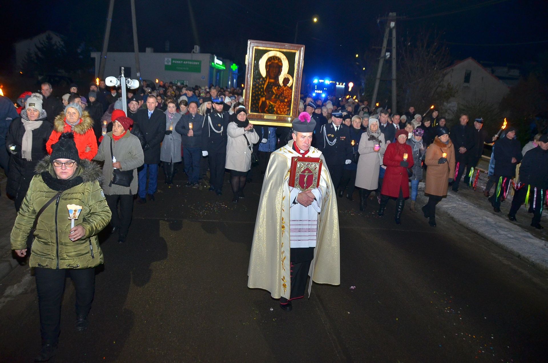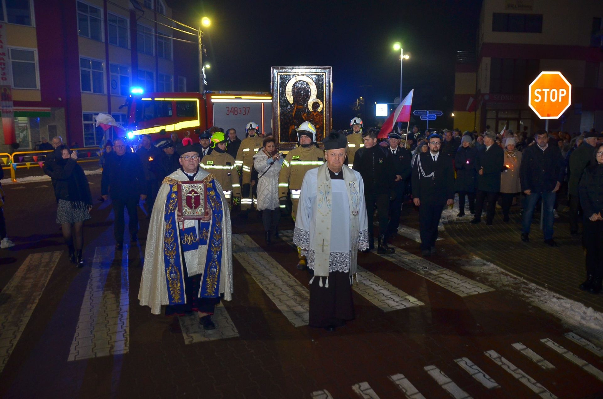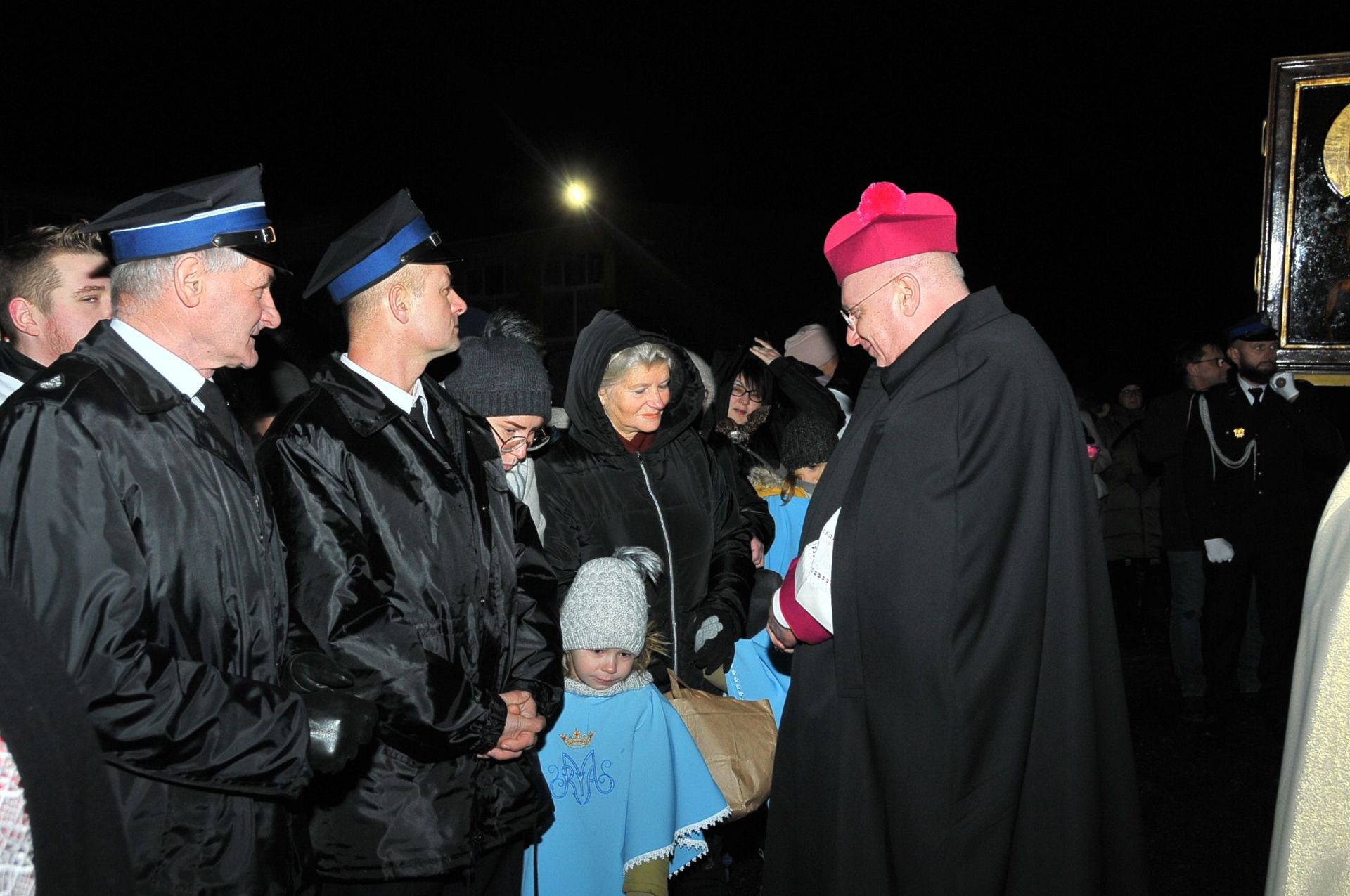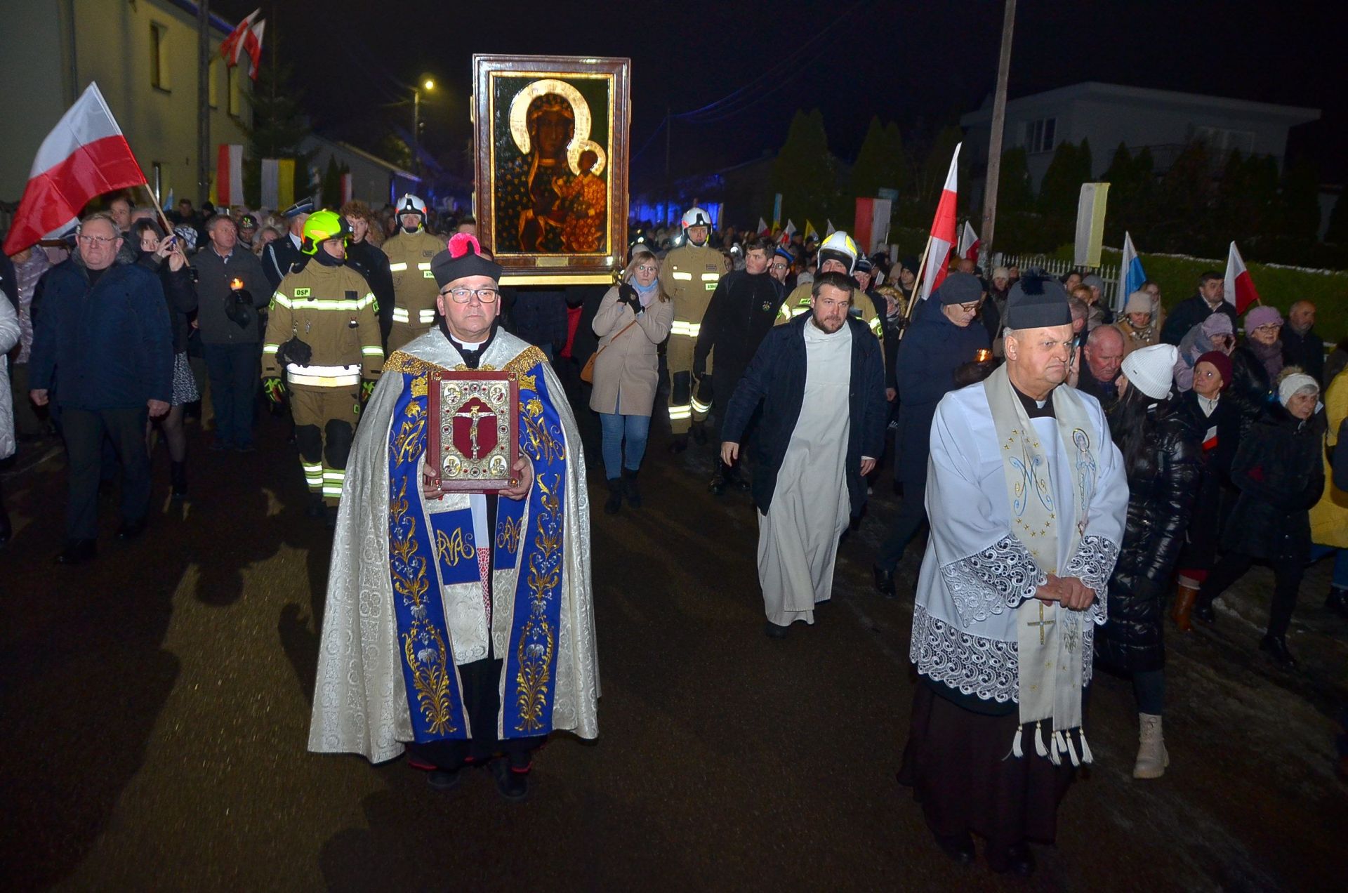 2 grudnia 2023 r. o godzinie 17.30 Matka Boża w znaku Ikony Jasnogórskiej, w asyście straży pożarnych przybyła do nas z parafii Trutowo. Po fanfarach odegranych przez naszą orkiestrę strażacką ksiądz dziekan ucałował ramy obrazu, przejął Ewangeliarz od ojca proboszcza z Trutowa i w uroczystej procesji ul. Słowackiego i ul.3-go Maja udaliśmy się do naszej świątyni parafialnej, przed którą dołączył do nas ks. bp Wiesław Alojzy Mering, główny celebrans Mszy świętej powitania. Na rozpoczęciewikariusz ks. Sławomir Polaszek odśpiewał Ewangelię o nawiedzeniu św. Elżbiety przez Maryję, podczas której razem z parafialnym chórem pod dyrekcją pana Andrzeja Inotlewskiego odśpiewaliśmy „Magnificat”.Następnie Maryję przywitał ksiądz proboszcz Krzysztof Graczyk, rodziny naszej parafii, młodzież i dzieci.Podczas Eucharystii koncelebrowanej przez księży z naszego dekanatu,kazanie wygłosił ksiądz rekolekcjonista Janusz Borucki.