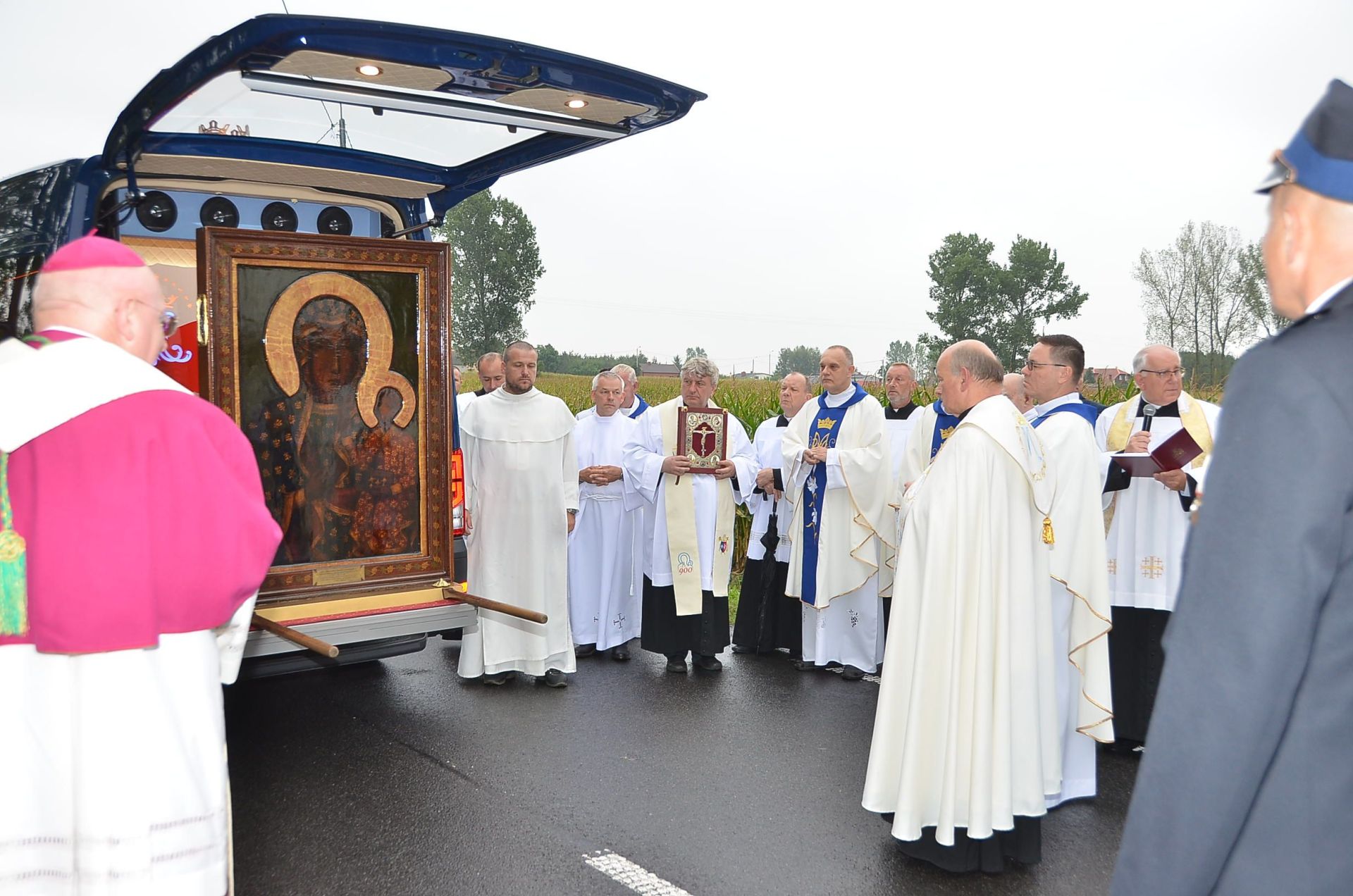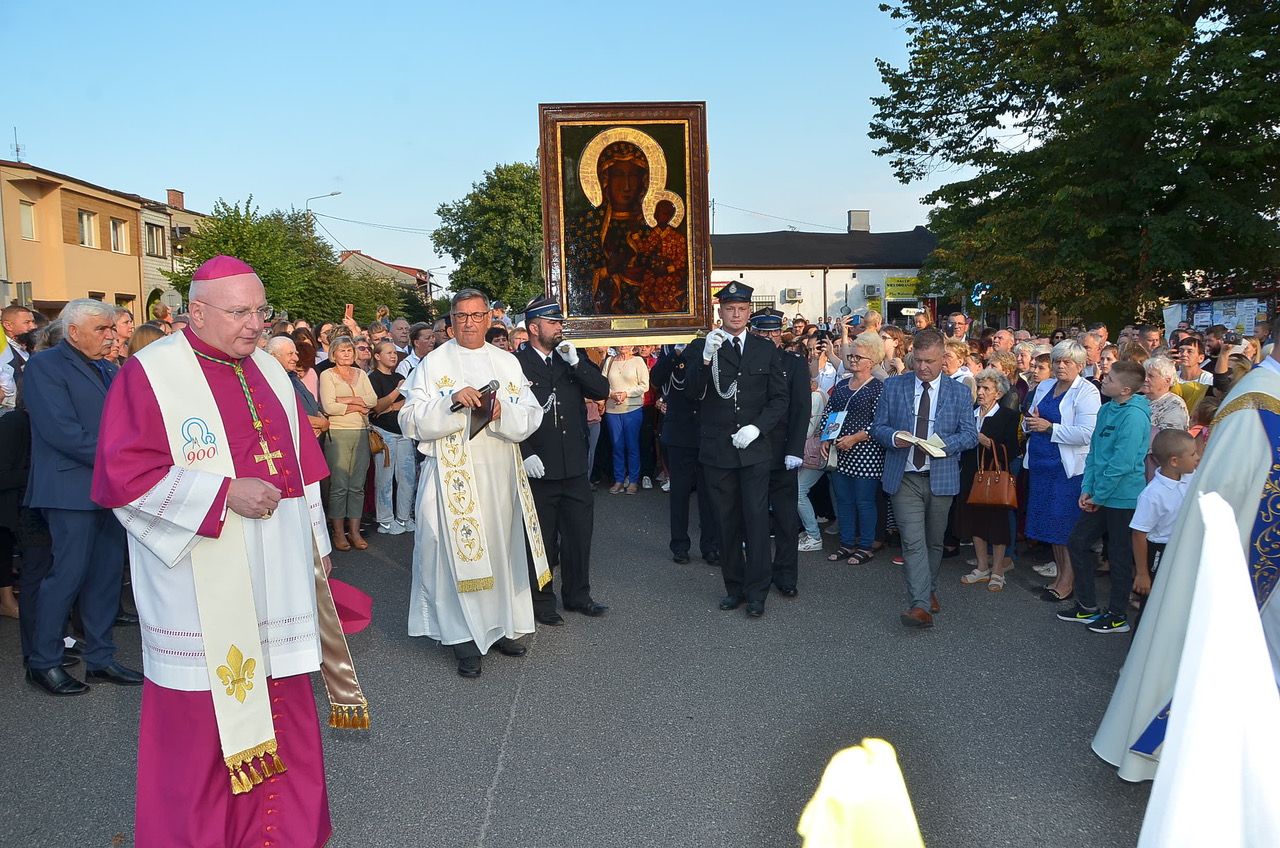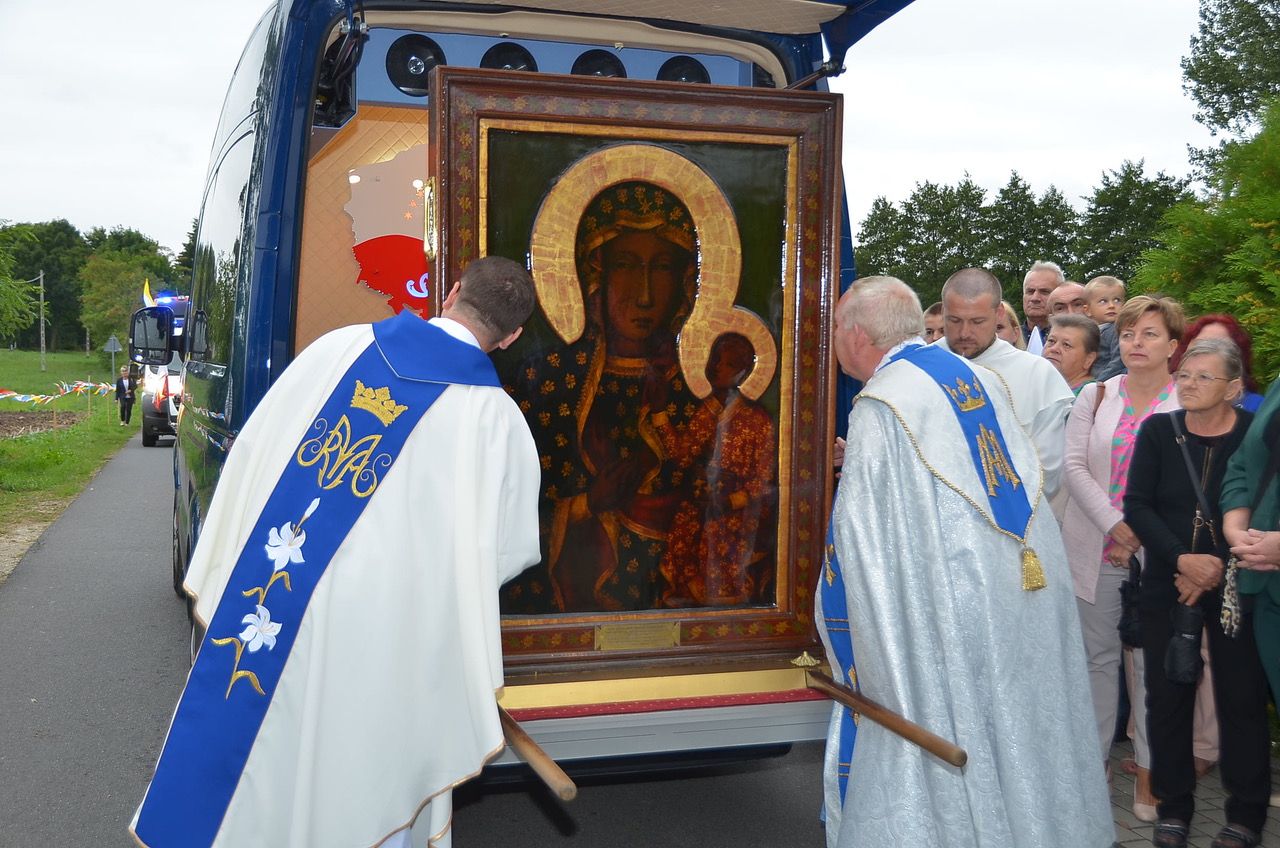 Dnia 26 sierpnia w dniu święta Matki Bożej Częstochowskiej, w asyście motocyklistów Obraz na pokładzie samochodu- kaplicy przyjechał z Brdowa, na miejsce oczekiwania – Plac Kościuszki, skąd w uroczystej procesji, na barkach strażaków, w orszaku wszystkich kapłanów z dekanatu, prowadzonych przez proboszcza parafii, dziekana i ks. Misjonarza, z towarzyszeniem orkiestry dętej, służby liturgicznej, dzieci sypiących kwiaty, sztandarów i feretronów został wniesiony do kościoła. O godz.17.30 odprawiona została powitalna Msza święta koncelebrowana przez księży z całego dekanatu, z udziałem chóru Dominanta i orkiestry dętej. Następnie modlitwa różańcowa, oraz Apel Jasnogórski prowadzony przez kustosza Obrazu, o. Pawła Subika OSPPE, które to uroczystości wypełniły wiernymi kościół i plac kościelny po brzegi. Nabożeństwo wdzięczności za zmarłych, którzy przekazali dar wiary, z nastrojowym zapalaniem zniczy w mroku i Pasterka Maryjna o powołania kapłańskie i zakonne tylko utwierdzały proboszcza parafii, że staje się pierwszy cud Nawiedzenia- tłum trwający na kolanach przed Ikoną. Po pasterce koncelebrowanej przez licznych kapłanów pracujących niegdyś w parafii nastąpiło nocne czuwanie. W ten święty czas Nawiedzenia, Matkę Bożą w Ikonie Jasnogórskiej adorowały poszczególne wioski, ulice, młodzież, dzieci, schola Hosanna, Żywy Różaniec, zespół muzyczny, Margaretki aż do rana.