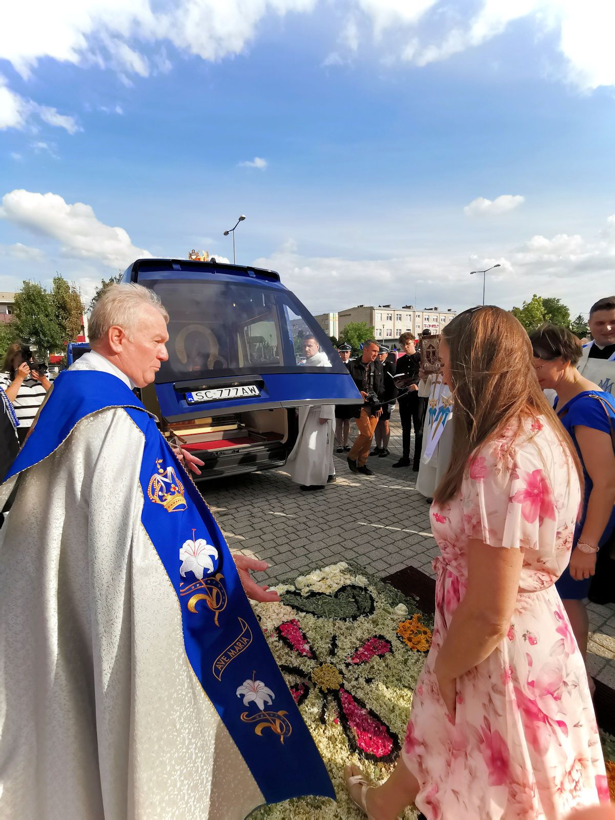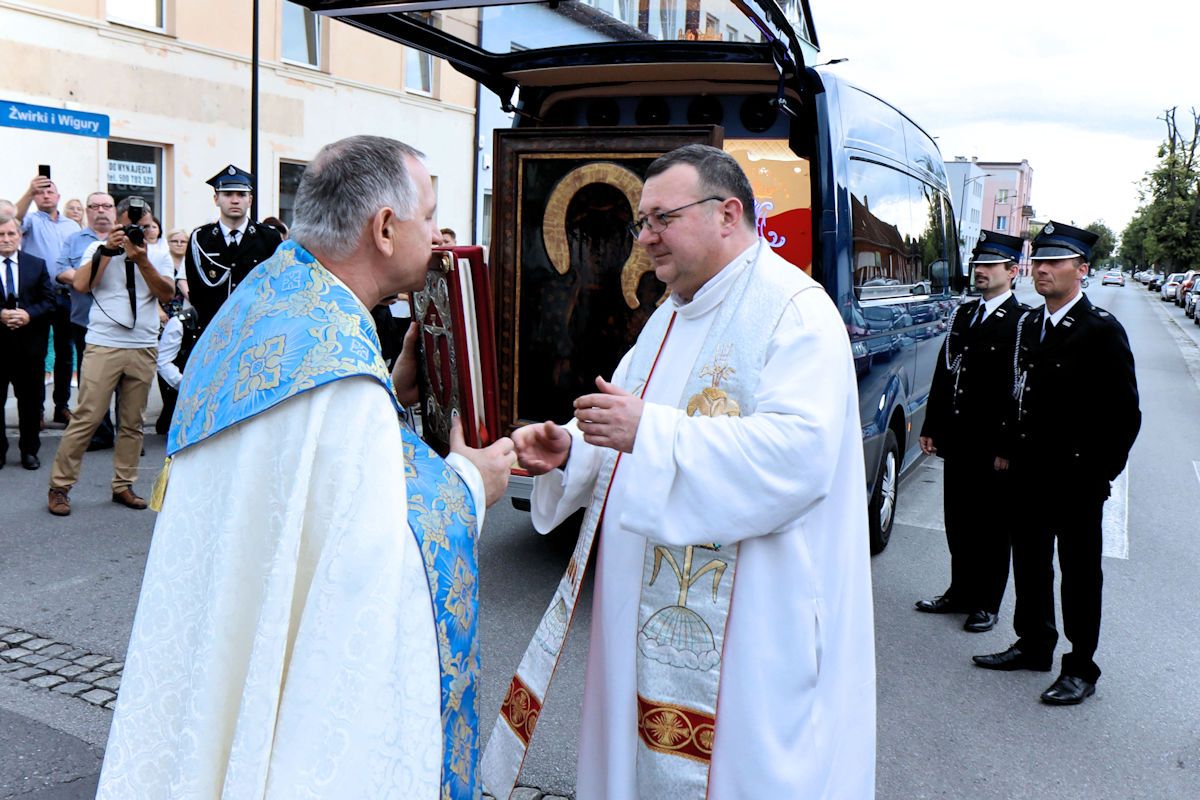 Po gorliwej modlitwie przeplatanej śpiewem pieśni Maryjnych nadszedł czas, by licznie zgromadzeni wierni pod przewodnictwem księdza proboszcza parafii Miłosierdzia Bożego oraz ks. Misjonarza w otoczeniu licznie zgromadzonych kapłanów z Dekanatu Konińskiego I oraz zaproszonych kapłanów gości – księży proboszczów i emerytów związanych z parafią wyszli na spotkanie samochodu kaplicy, by w uroczystej procesji powitać Obraz przekazany z parafii Krzyża Świętego w Kole. Oczekiwanie na Matkę Bożą było wypełnione modlitwą różańcową i śpiewem pieśni o Matce Bożej. Chwilę przez przybyciem Obrazu dotarli bp Senior Wiesław Mering wraz z proboszczem wspomnianej kolskiej Fary ks. kanonikiem Eugeniuszem Strzechem. Przywieziony przez ojca Pawła z Zakonu Paulinów Wizerunek Jasnogórski został powitany pocałunkiem przez ks. Seniora Wiesława Meringa oraz proboszcza par. Miłosierdzia Bożego ks. Romana Ziemińskiego, a po przekazaniu przez ks. Eugeniusza Strzecha Księgi Ewangeliarza ks. proboszczowi Romanowi Ziemińskiego, reprezentacje stanów podjęły feretron Obrazu Matki Bożej Częstochowskiej, by wnieść go do świątyni (fot. 2).