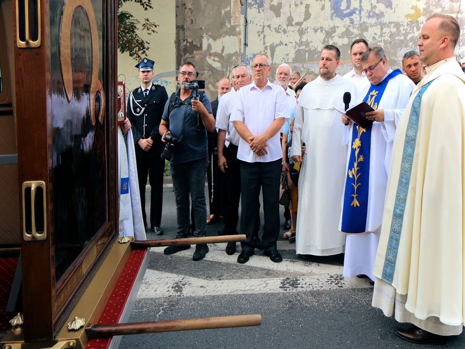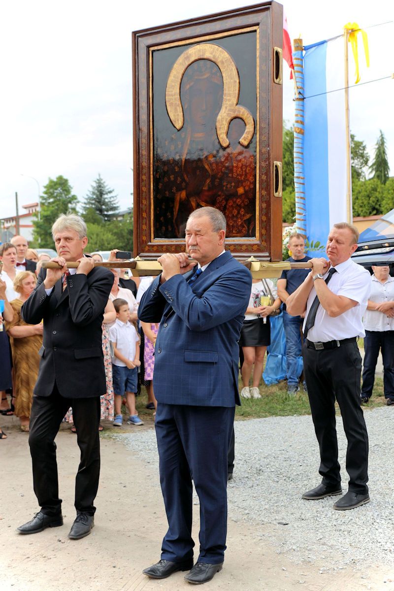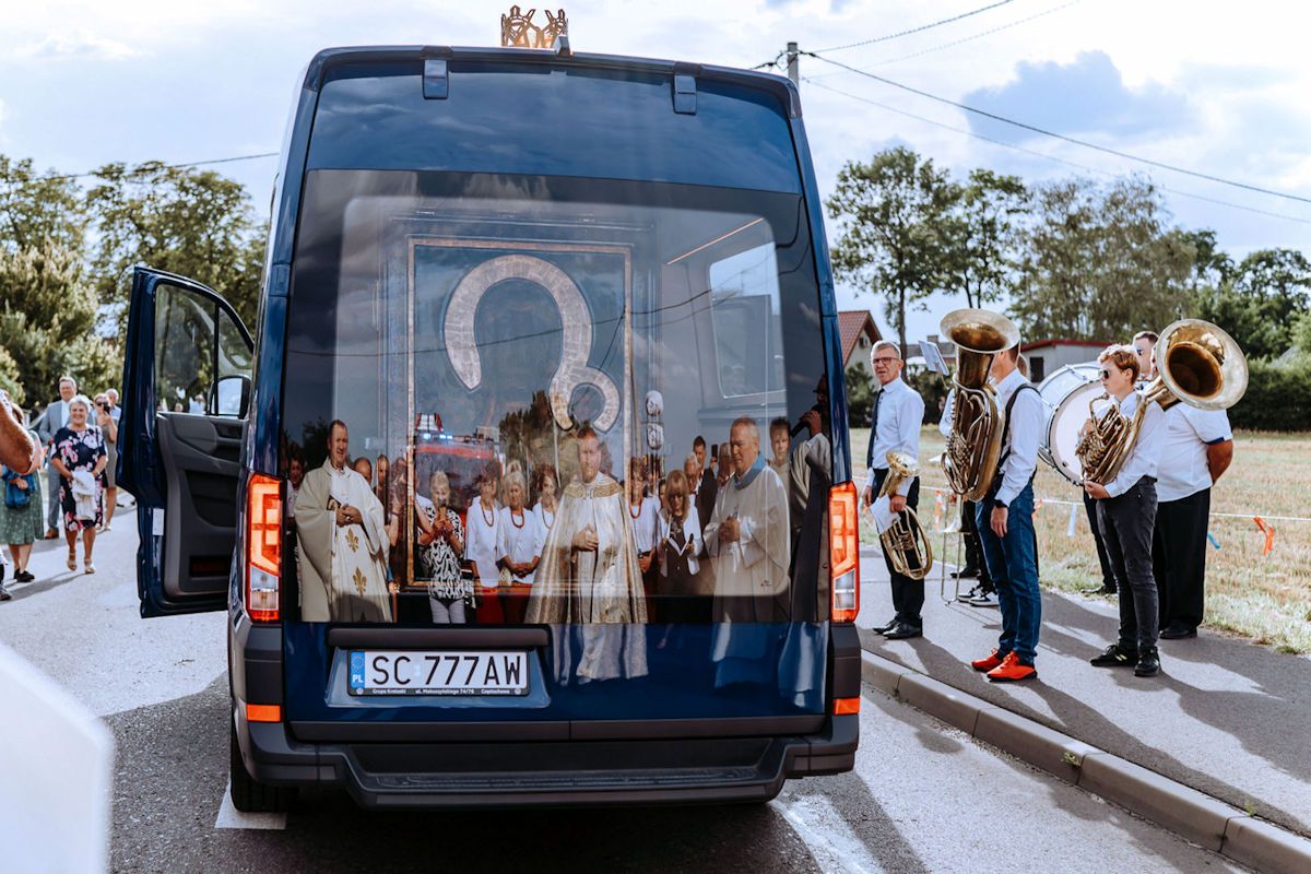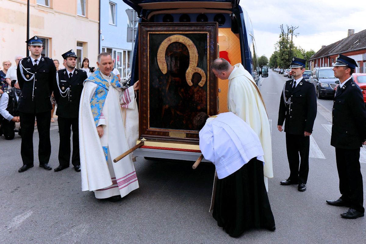 Nawiedzenie Matki Bożej w znaku Ikony Jasnogórskiej rozpoczęło się wpiątek 28 lipca, o godzinie 17.30 na placu obok figury św. Józefa. Poprzedzone było nabożeństwem oczekiwania w kościele. Wizerunek Jasnogórskiej Panizostałprzyprowadzony przez wozy strażackie z parafii Sławsk na czele zks. Tomaszem Jenerem, który przekazał takżeewangeliarzna ręce ks. Proboszcza. W powitalnym orszaku Królowej brała udział asysta, ministranci a także Orkiestra. Zaszczytu niesienia Ikony Jasnogórskiej Pani, dostąpili: strażacy z OSP, przedstawiciele ojców, przedstawicielki matekoraz przedstawiciele młodzieży.