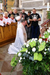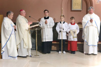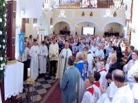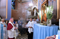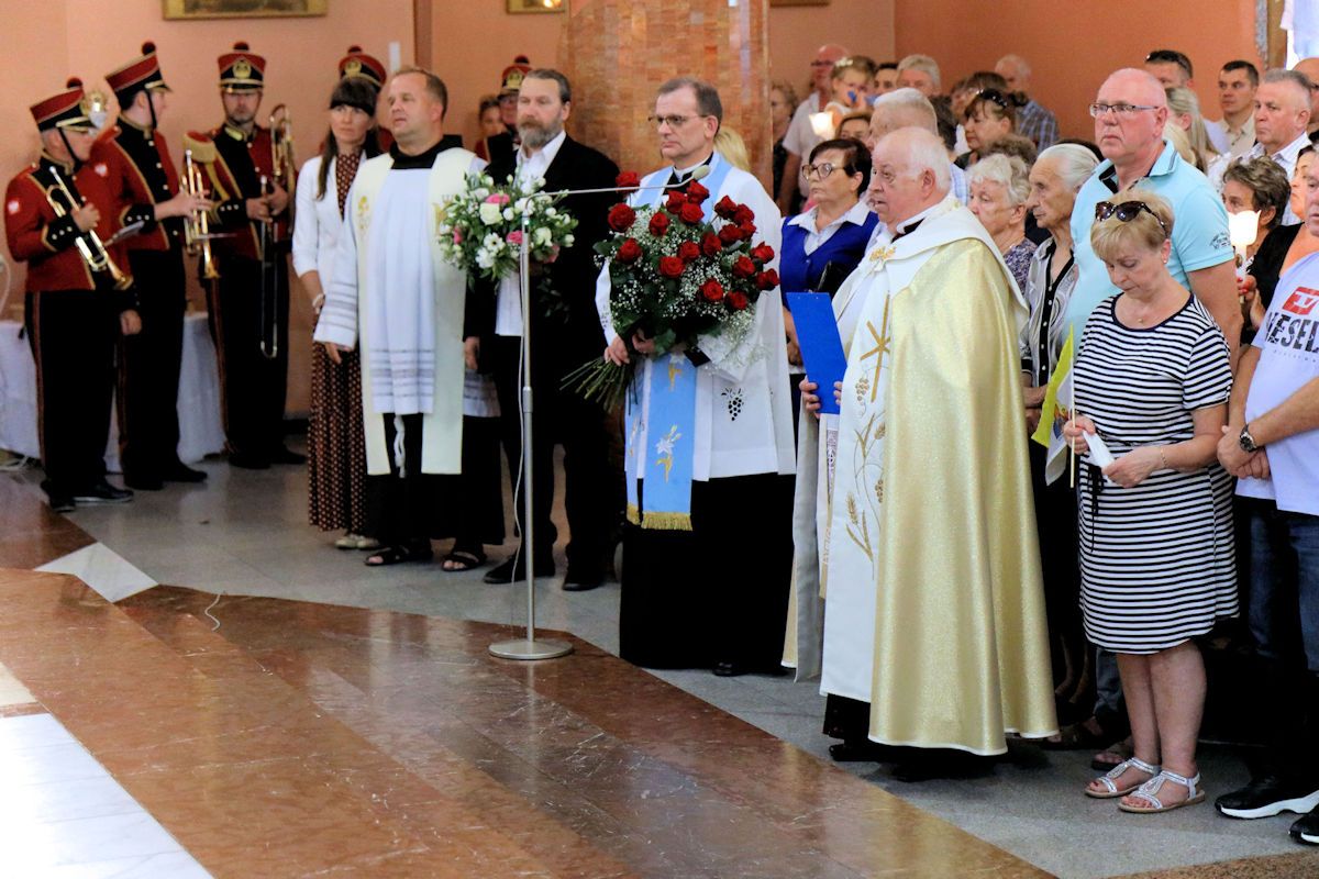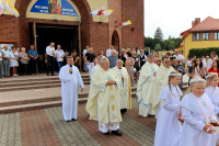 Po ustawieniu na tronie Obrazu (fot. nr 3) i uczczeniu przez przepisane ceremoniałem obrzędy nastąpił obrzęd symbolicznego pożegnania Matki Bożej przez proboszcza parafii pw. Świętego Krzyża w Kole oraz przybyłych z nim delegatów tamtejszej parafii znakiem złożenia wiązanki kwiatów przy obrazie (fot. nr 4). Teraz nastąpiły serdeczne powitania złożenie bukietów kwiatów przez proboszcza witającej parafii ks. Romana Ziemińskiego, rodziny, młodzież i dzieci. Na prośbę ks. proboszcza Dziekan Dekanatu Konińskiego I ks. prałat Tomasz Michalski odczytał pismo z Sekretariatu Stanu Stolicy Apostolskiej na okoliczność obchodów Jubileusz 900-lecia Istnienia Diecezji Włocławskiej oraz Peregrynacji Ikony Jasnogórskiej, po czym rozpoczęła się pod przewodnictwem biskupa Seniora ks. Wiesława Meringa uroczysta msza święta koncelebrowana przez wszystkich kapłanów na Powitanie Wizerunku Jasnogórskiego (fot. nr 5). Homilię wygłosił ks. Misjonarz Łukasz Skarżyński, w której podzielił się doświadczeniami i łaskami, o których słyszał się od osób, które ofiarowały swoje życie Panu Bogu przez Maryję. Na zakończenie mszy św. miejscowy ks. proboszcz podziękował ks. biskupowi Seniorowi wspominając swoje przeżycia z nawiedzenia Obrazu w 1975 r. w jego rodzinnej parafii Kikół, a bp Wiesław Mering podkreślił znaczenie wydarzenia jakim jest Peregrynacja Obrazu i jej wpływ na życie tych którzy stają przy Maryi i udzielił uroczystego błogosławieństwa całemu zgromadzeniu liturgicznemu.