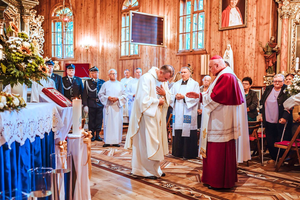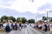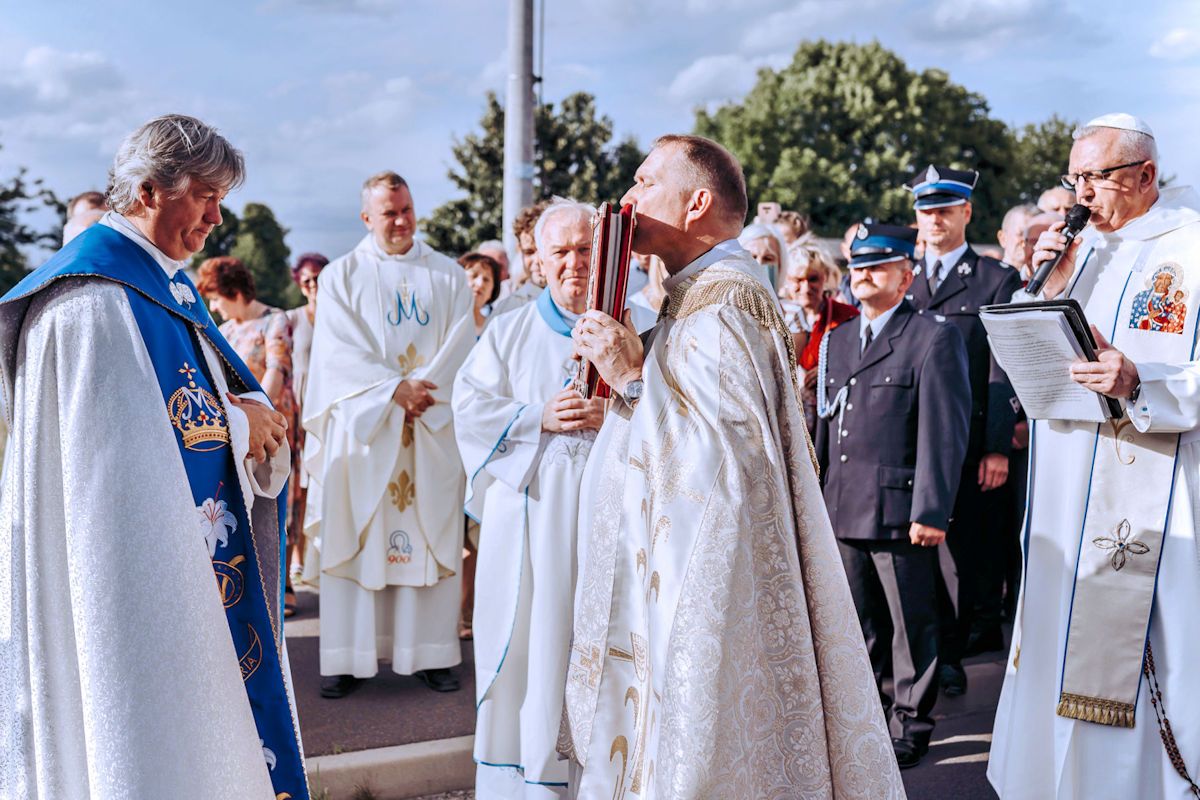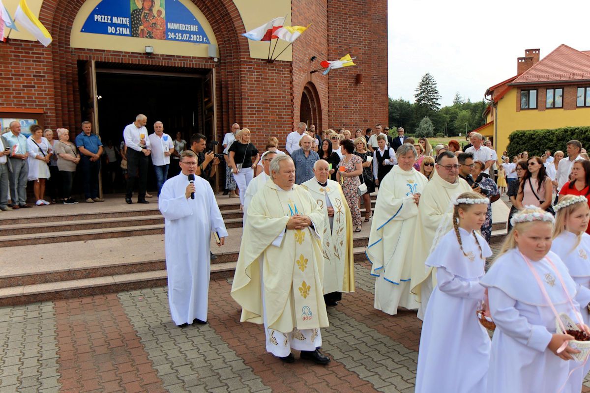 Przygotowanie do łaski Nawiedzenia Wizerunku Jasnogórskiego parafii św. Wawrzyńca w Sławsku po ponad 48 latach w dniach 27 i 28 lipca 2023 r. parafia rozpoczęła od przeżycia Misji Nawiedzenia, które rozpoczęły się w niedzielę 23 lipca br. Prowadził je zaproszony misjonarz – ojciec Sylwester Kopyt z Zakonu Paulinów. Oprócz odprawianych mszy św. z naukami, każdego dnia o godz. 21.00 odbywał się Apel Jasnogórski. W przededniu Nawiedzenia, środę 26 lipca br. parafianie przed mszami o 9.00 i 20.00 przyjęli w spowiedzi łaskę pokuty i pojednania – serdeczne Bóg zapłać dla kapłanów z Dekanatu Konińskiego I oraz wspomagających ks. seniorów za posługę sakramentalną w konfesjonałach. Wreszcie nadszedł wyczekiwany dzień Peregrynacji Wizerunku Matki Bożej Częstochowskiej w naszej sławskiej parafii. O 17.00 Misjonarz ojciec Sylwester Kopyt w asyście proboszcza parafii ks. Tomasza Jenera oraz kapłanów dekanatu dla wiernych szczelnie wypełniających niewielką świątynię, teren przed nią i ogrodzeniem kościoła oraz zgromadzonych na trasie prowadzenia Obrazu, rozpoczął Nabożeństwo Oczekiwania. W trakcie gorliwej modlitwy na znak ojca Sylwestra ze śpiewem pieśni Maryjnych całe zgromadzenie ruszyło procesją za krzyżem, pocztami sztandarowymi Jednostek OSP z Branna, Osieczy i Sławska, chorągwiami kościelnymi, feretronami niesionymi przez panie z KGW i różańcem niesionym przez Żywy Różaniec, Liturgiczną Służbą Ołtarza i Szafarzami Najświętszego Sakramentu na spotkanie samochodu Kaplicy z Wizerunkiem Jasnogórskim. Oczekiwanie na Matkę Bożą było wypełnione modlitwą zawierzenia i modlitwą różańcową i śpiewem pieśni o Matce Bożej. Wreszcie usłyszeliśmy sygnały dźwiękowe i zobaczyliśmy wóz bojowy OSP ze Sławska prowadzący kolumnę motocyklistów asystujących samochodowi Kaplicy z Obrazem z jej Kustoszem ojcem Dariuszem Nowickim, która przybyła pięknie udekorowaną trasą chorągiewkami i sznurami powiewających wstążek od Starego Miasta. Wizerunek Jasnogórski został powitany pocałunkiem przez Dziekana Dekanatu Konińskiego I ks. prałata Tomasza Michalskiego i proboszcza witającej ks. Tomasza Jenera, po czym nastąpiło przekazanie Księgi Ewangeliarza przez ks. kanonika Mirosława Dereszewskiego, proboszcza parafii Świętych Apostołów Piotra i Pawła w Starym Mieście żegnającej Obraz proboszczowi parafii Sławsk. Po tej ceremonii Druhowie OSP unieśli obraz dla ukazania wielkiemu zgromadzeniu witających Matkę Bożą i przekazali delegacji parafian z Branna, po nich z Osieczy Drugiej, następnie z Osieczy Pierwszej i parafianie ze Sławska, którzy przed kościołem przekazali feretron Obrazu Ochotnikom Strażakom, by wnieść go do świątyni i ustawić na przygotowanym ozdobnym tronie w otoczeniu bogatej dekoracji kwiatowej. Po ustawieniu Obrazu, okadzenia dokonał Dziekan ks. prałat Tomasz Michalski, który zapalił także świecę Nawiedzenia i Jubileuszu Diecezji, a tekst Ewangelii o Nawiedzeniu Św. Elżbiety odśpiewał wikariusz konińskiej Fary ks. Bartłomiej Pyka. Ks. prałat Tomasz Michalski odczytał pismo z Sekretariatu Stanu Stolicy Apostolskiej na okoliczność obchodów Jubileusz 900-lecia Istnienia Diecezji Włocławskiej oraz Peregrynacji Ikony Jasnogórskiej i nastąpił obrzęd ceremonialnego pożegnania Matki Bożej przez proboszcza parafii pw. Świętych Apostołów Piotra i Pawła w Starym Mieście oraz przybyłej z nim delegatów tamtejszej parafii znakiem złożenia wiązanki kwiatów przy obrazie. Teraz nastąpiły powitania przez przemowy i złożenie bukietów kwiatów przez proboszcza witającej parafii ks. Tomasza Jenera, rodzinę z Osieczy Drugiej, młodzież z Branna i dzieci z Osieczy Pierwszej. Po dokonaniu się ceremonii powitalnych rozpoczęła się uroczysta msza święta koncelebrowana pod przewodnictwem proboszcza par. Sławsk i wszystkich kapłanów Dekanatu Konińskiego I. Homilię wygłosił Paulin ojciec Sylwester, w której uświadomił o wielkiej łasce i darze spotkania z Matką Zbawiciela i jej pośredniczeniu w łaskach tym większych, im bardziej wierni omadlają obraz. Przed błogosławieństwem Kustosz Samochodu Kaplicy ojciec Dariusz zaprosił do udziału w Apelu Jasnogórskim o 21.00 i wykorzystaniu czasu na modlitwę wspólną i indywidualną. Według programu o 21.00 odbył się wspomniany Apel prowadzony przez ojca Dariusza, od 22.00 parafianie zorganizowali adorację muzyczną z recytacją rozważań, o 23.00 nabożeństwo wdzięczności za wiarę przodków, w czasie której śpiew prowadził Gminny Chór „Dominium”. O północy z 27 na 28 lipca została odprawiona Pasterka Nawiedzenia w intencji powołań do kapłaństwa, której przewodniczył i wygłosił homilię ks. kanonik Benedykt Gembicki, do 2020 r. proboszcz parafii Sławsk, który obecnie mieszka i gorliwie służy Panu na emeryturze w Kaliszu, a koncelebransami byli – przebywający na urlopie ks. Jerzy Słowiński – Chrystusowiec przybyły z Australii, Paulin ojciec Sylwester Kopyt oraz sławski proboszcz ks. Tomasza Jener. Po mszy rozpoczęła się nocna adoracja Obrazu w asyście Druhów Ochotników z parafii do godz. 8.00. Godzinki o 8.00 poprowadziła organistka Pani Agata Gierłowska, o 9.00 ojciec Dariusz Nowicki odprawił mszę św. Nawiedzenia dla chorych z udzieleniem sakramentu chorych, a o godz. 11.00 Misjonarz ojciec Kopyt mszę św. z błogosławieniem dzieci i matek. O godz. 15.15 parafialny Żywy Różaniec zaczął odmawiać różańcowe tajemnice bolesne, a o 16.00 Biskup Włocławski, Jego Ekscelencja ks. Krzysztof Wętkowski rozpoczął mszę św. Pożegnania Obrazu. W homilii Pasterz Diecezji ukazał, jak wykorzystać czas po Nawiedzeniu w osobistym pogłębieniu wiary. Po mszy św. ojciec Dariusz pobłogosławił pomniejszoną kopię obrazu Matki Bożej Częstochowskiej (Bo takowego wizerunku w kościele, poza papierową pamiątką Nawiedzenia