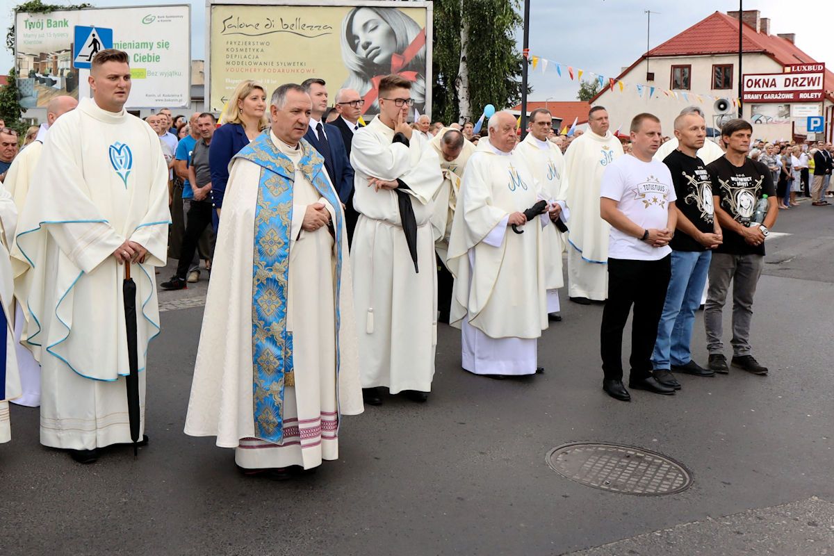 Wtorek 25 lipca br. to kolejny dzień Peregrynacji Wizerunku Jasnogórskiego Matki Bożej Częstochowskiej w Dekanacie Konińskim I, tego dnia w parafii pw. Matki Bożej z Guadalupe w Żychlinie. Do spotkania z Matką Bożą Częstochowską i jej Synem, parafian przygotowywał rekolekcjami ojciec Paulin Jerzy Mac. O wyznaczonej porze na 17.00 w obecności wiernych wypełniających świątynię, teren przed rozpoczęło się Nabożeństwo Oczekiwania prowadzone przez Ojca Jerzego Maca oraz proboszcza parafii pw. Matki Bożej z Guadalupe w Żychlinie ks. kanonika Waldemara Szafrańskiego. Po gorliwej modlitwie przeplatanej śpiewem pieśni Maryjnych nadszedł czas, by licznie zgromadzeni wierni pod przewodnictwem księdza proboszcza parafii Miłosierdzia Bożego oraz ks. Misjonarza w otoczeniu kapłanów z Dekanatu Konińskiego I w procesji prowadzonej przez krzyż, poczty sztandarowe jednostek OSP oraz asysty liturgicznej z Kół Gospodyń Wiejskich ruszyli w kierunku ronda, gdzie miało się dokonać spotkanie samochodu Kaplicy z Wizerunkiem Jasnogórskim. Oczekiwanie na Matkę Bożą było wypełnione modlitwą zawierzenia i śpiewem pieśni o Matce Bożej. Przybyły przez ojca Pawła z Zakonu Paulinów Wizerunek Jasnogórski został powitany pocałunkiem przez Dziekana Dekanatu Konińskiego I ks. prałata Tomasza Michalskiego i parafii witającej ks. kanonika Waldemara Szafrańskiego, po czym nastąpiło przekazanie Księgi Ewangeliarza przez proboszcza parafii Brzeźno proboszczowi parafii w Żychlinie. Po tej ceremonii Druhowie OSP z parafii podjęły feretron Obrazu Matki Bożej Częstochowskiej, by wnieść go do świątyni. Po ustawieniu na tronie Obrazu, okadzeniu przez ks. proboszcza oraz zapaleniu świecy Nawiedzenia i Jubileuszu, ks. proboszcz Waldemar Szafrański odczytał Ewangelię o Nawiedzeniu Św. Elżbiety. Teraz Dziekan ks. prałat Tomasz Michalski odczytał pismo z Sekretariatu Stanu Stolicy Apostolskiej na okoliczność obchodów Jubileusz 900-lecia Istnienia Diecezji Włocławskiej oraz Peregrynacji Ikony Jasnogórskiej i nastąpił obrzęd symbolicznego pożegnania Matki Bożej przez proboszcza parafii pw. Matki Bożej Nieustającej Pomocy w Brzeźnie oraz przybyłych z nim delegatów tamtejszej parafii znakiem złożenia wiązanki kwiatów przy obrazie. Teraz nastąpiły powitania przez przemowy i złożenie bukietów kwiatów przez proboszcza witającej parafii ks. Waldemara Szafrańskiego, rodziny, młodzież i dzieci. Po dokonaniu się ceremonii powitalnych rozpoczęła się uroczysta msza święta koncelebrowana pod przewodnictwem proboszcza par. Żychlin i kapłanów z dekanatu. Homilię wygłosił ojciec Jerzy Mac.