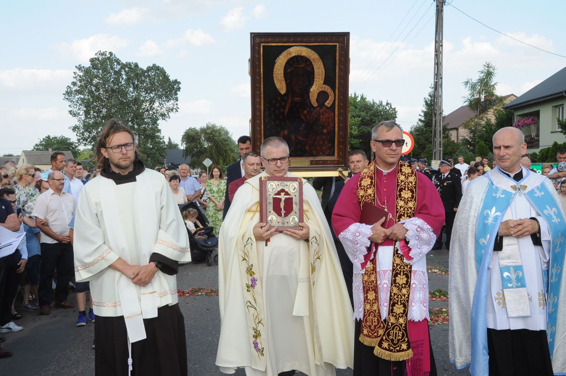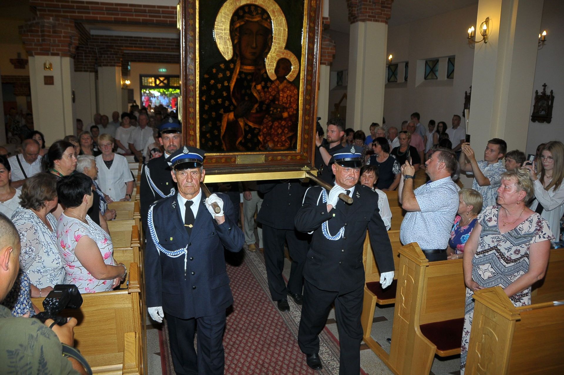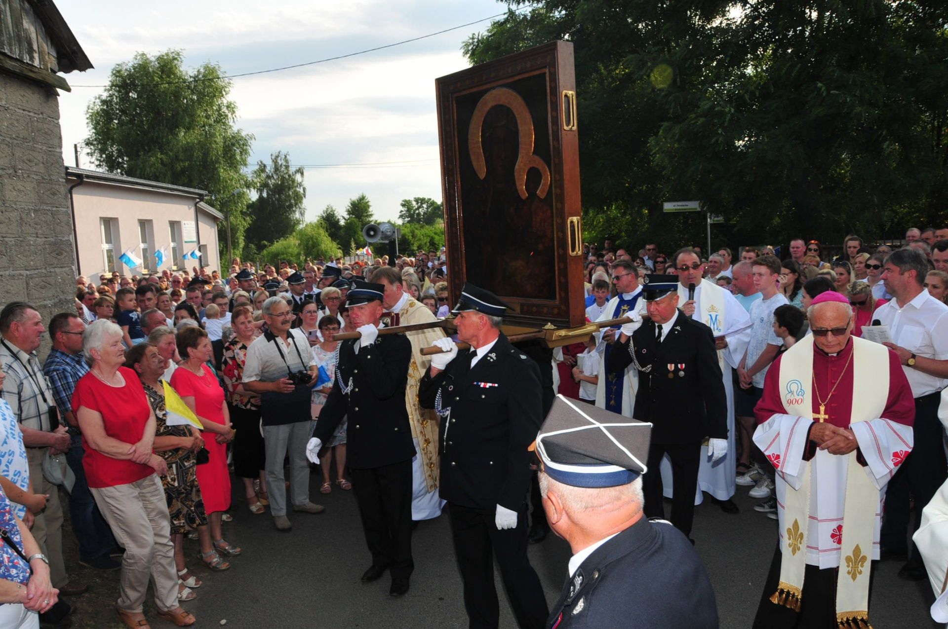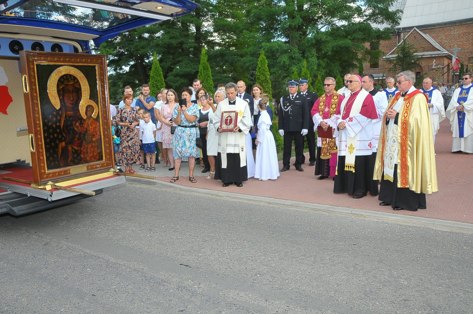 W sobotę 8 lipca, o godzinie 17.00 wierni bardzo licznie zgromadzili się w kościele na oczekiwanie przybycia do Matki Bożej. Po krótkiej modlitwie i wspólnym śpiewie wszyscy wierni wraz ze strażakami z udali się przed plac Gminny by oczekiwać na przyjazd Matki Bożej. Około godziny 17.30 o. Paweł – kustosz Obrazu Matki Bożej z korowodem policji, motocyklistów i straży przywiózł z parafii Brudzew Jasnogórską Ikonę. Następnie ks. Bp Krzysztof Wętkowski i ks. dziekan wraz kapłanami, asystą, służbą liturgiczną i strażakami którzy na swoich ramionach nieśli Ikonę Matki Bożej procesyjnie udali się do Kościoła.