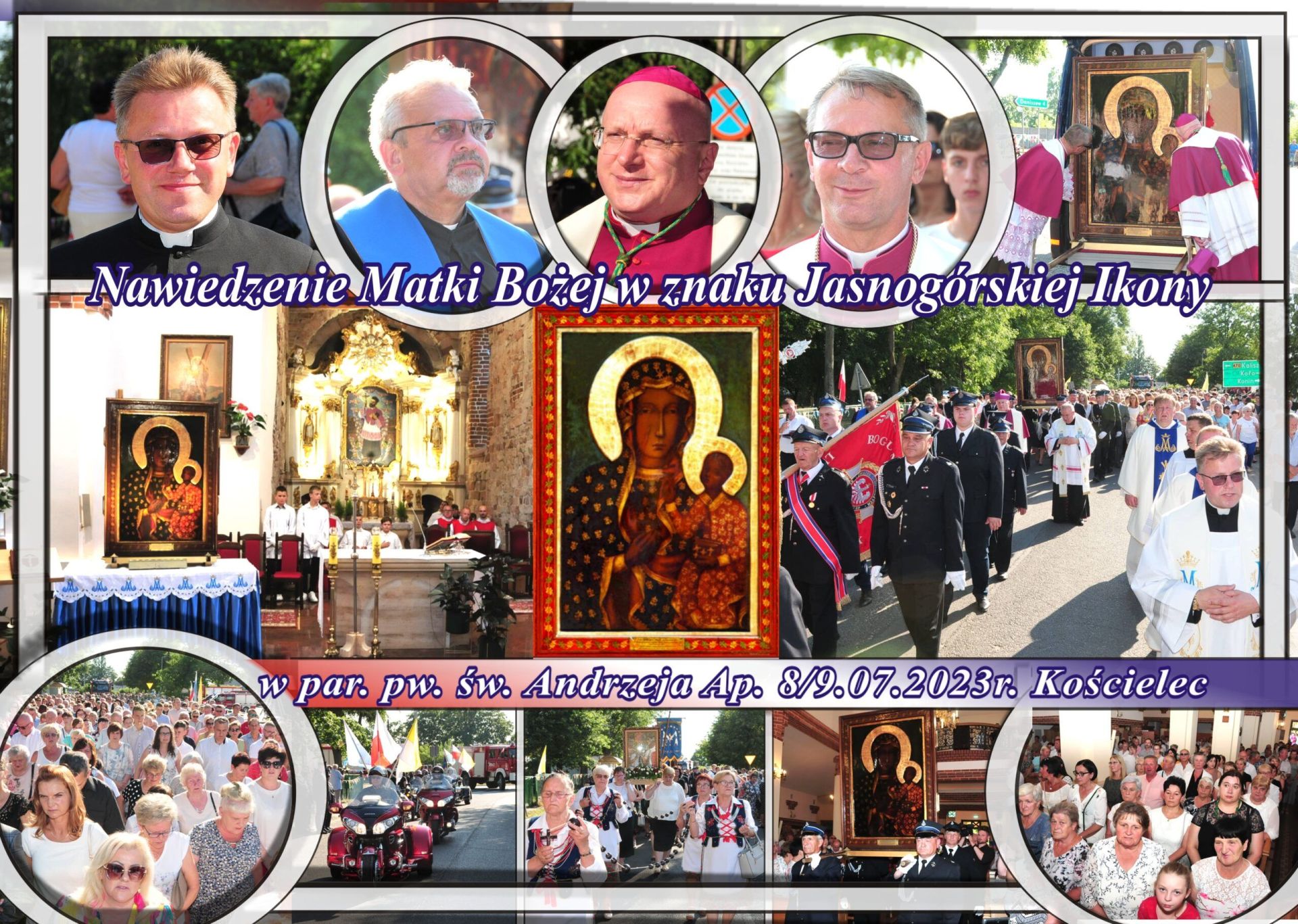 W parafii Św. Andrzeja Apostoła w Kościelcu Matka Boża w znaku Jasnogórskiej Ikony przebywała w dniach 8 i 9 lipca 2023r. Jej Nawiedzenie poprzedziły tygodniowe Misje Święte, które trwały od 2 do 7 lipca 2023 prowadzone przez o. superiora Waldemara Janeckiego OMI misjonarza Oblata Maryi Niepokalanej z Katowic. W czasie Misji Świętych wierni gromadzili się w kościele o godzinie 9.00 i 18.00 najpierw na wspólnym różańcu a następnie o godzinie 9.30 i 18.30 Eucharystii z kazaniem Misyjnym i 20.30 na Apelu Jasnogórskim. Każdego dnia wierni mogli skorzystać z sakramentu pokuty i pojednania, tak aby nikt nie pozostał bez możliwości rozgrzeszenia i przyjęcia Pana Jezusa do swojego serca. W czasie Misji odbyło się nabożeństwo za zmarłych na cmentarzu. W czwartek był dzień modlitwy o nowe i święte powołania kapłańskie i zakonne. W piątek miało miejsce nabożeństwo Ekspiacyjne, które zakończyło się procesją do Krzyża Misyjnego. Ojciec misjonarz dokonał poświęcenia Krzyża misyjnego, a wierni mogli oddać cześć krzyżowi przez ucałowanie czy dotknięcie. Następnie ojciec misjonarz udzielił wszystkim uroczystego błogosławieństwa.