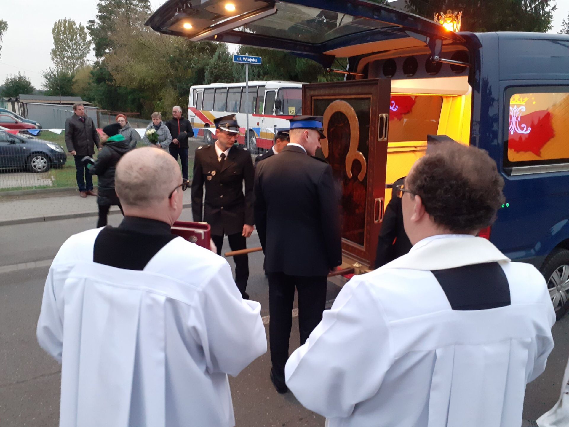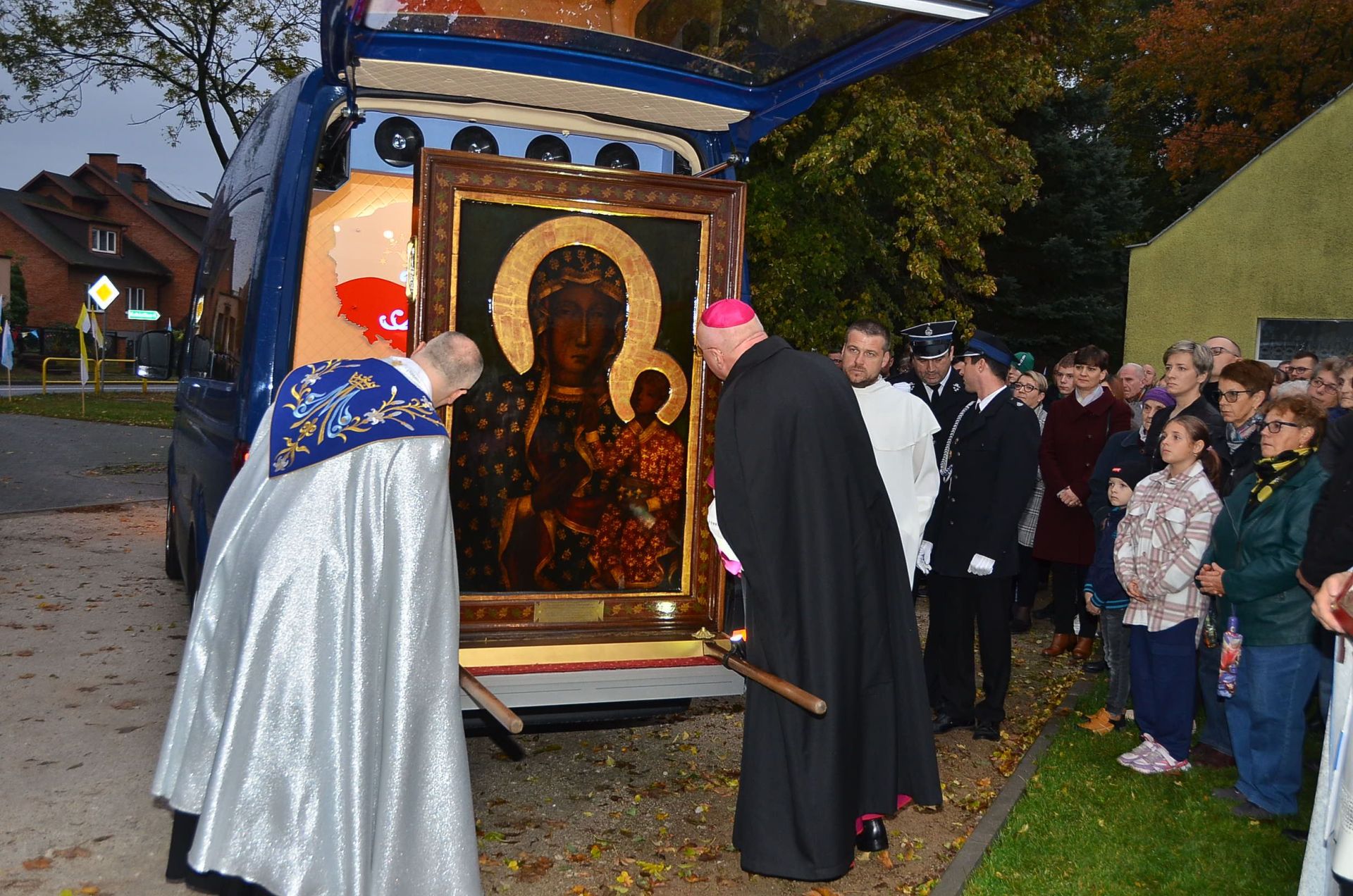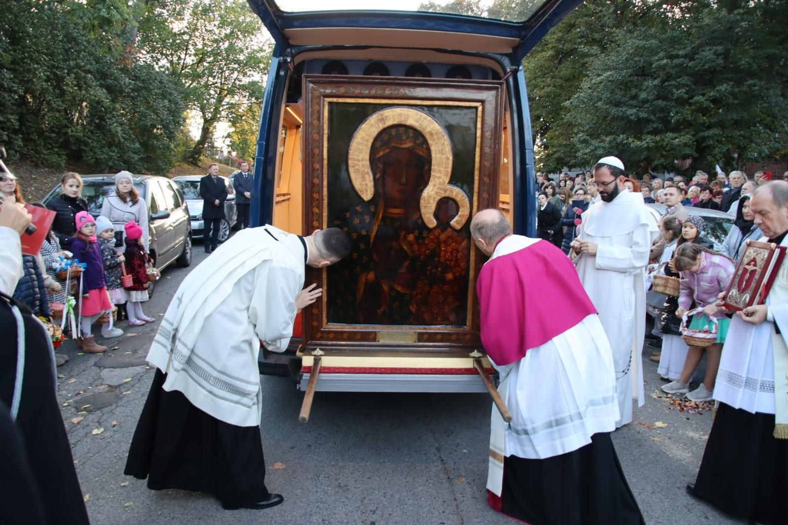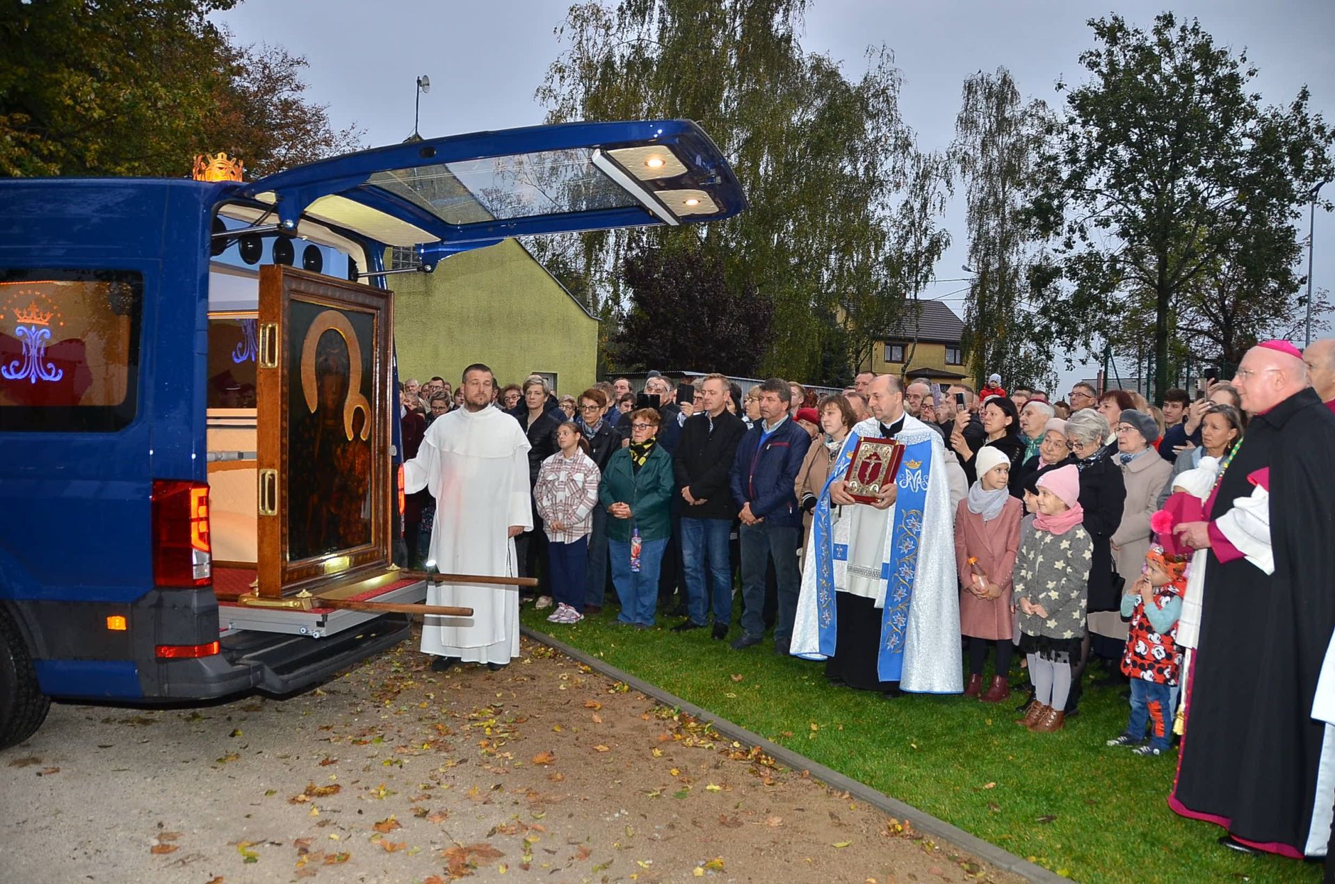 W poniedziałkowe popołudnie. o godz. 16.45 liczna rzesza wiernych zebrała się w sanktuarium, by uczestniczyć w modlitewnym nabożeństwie oczekiwania. Tuż przed godziną 17.15 ze świątyni wyruszyła procesja, aby na granicy parafii oczekiwać na Maryję. Po powitaniu i ucałowaniu Obrazu przez księdza biskupa i ojca proboszcza Krzysztofa Tarnowskiego, ks. Ireneusz Mrowicki, proboszcz parafii Wniebowzięcia NMP przekazał o. Krzysztofowi Ewangeliarz.