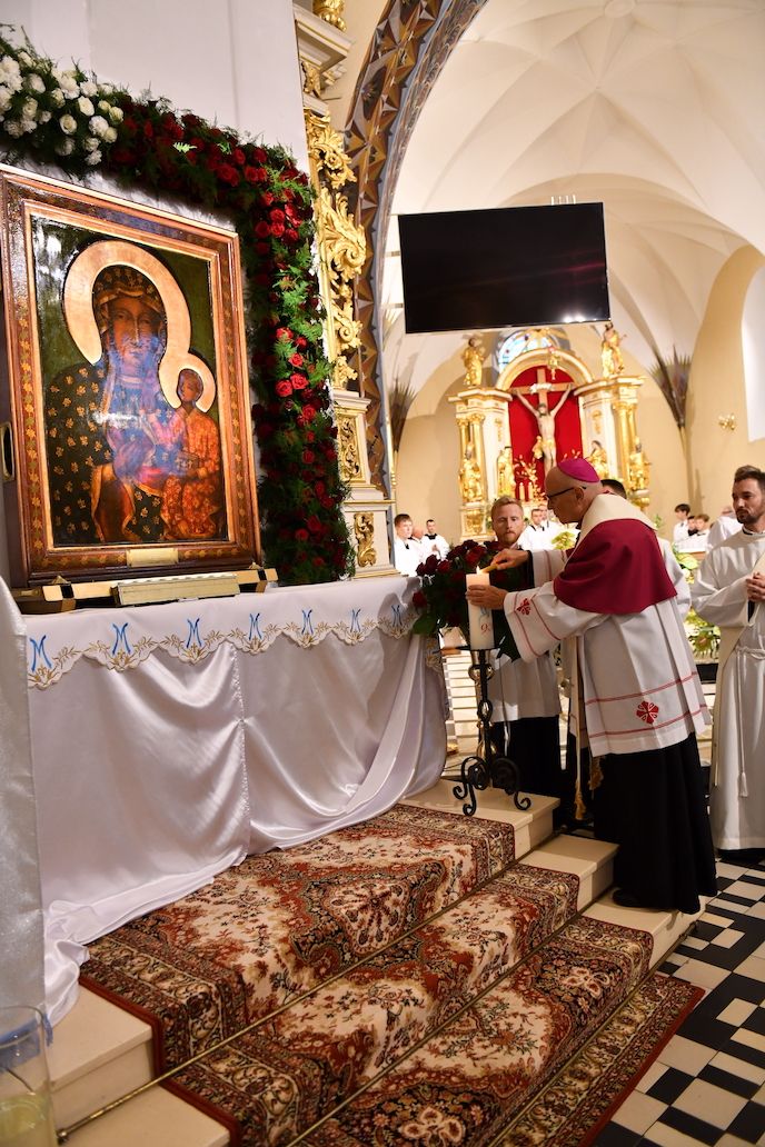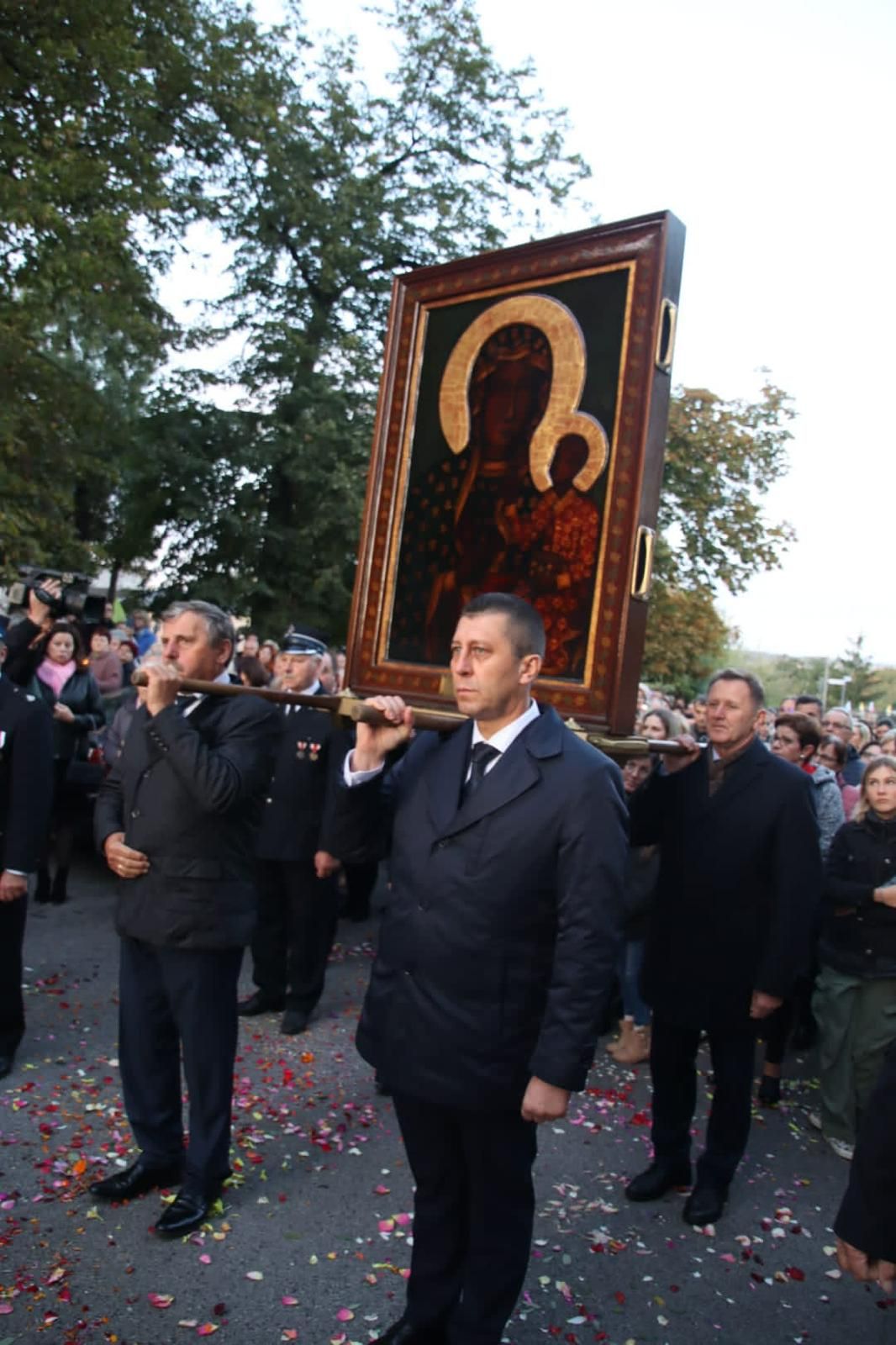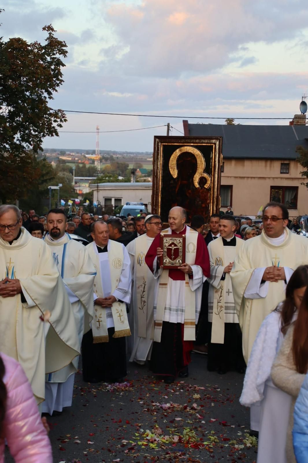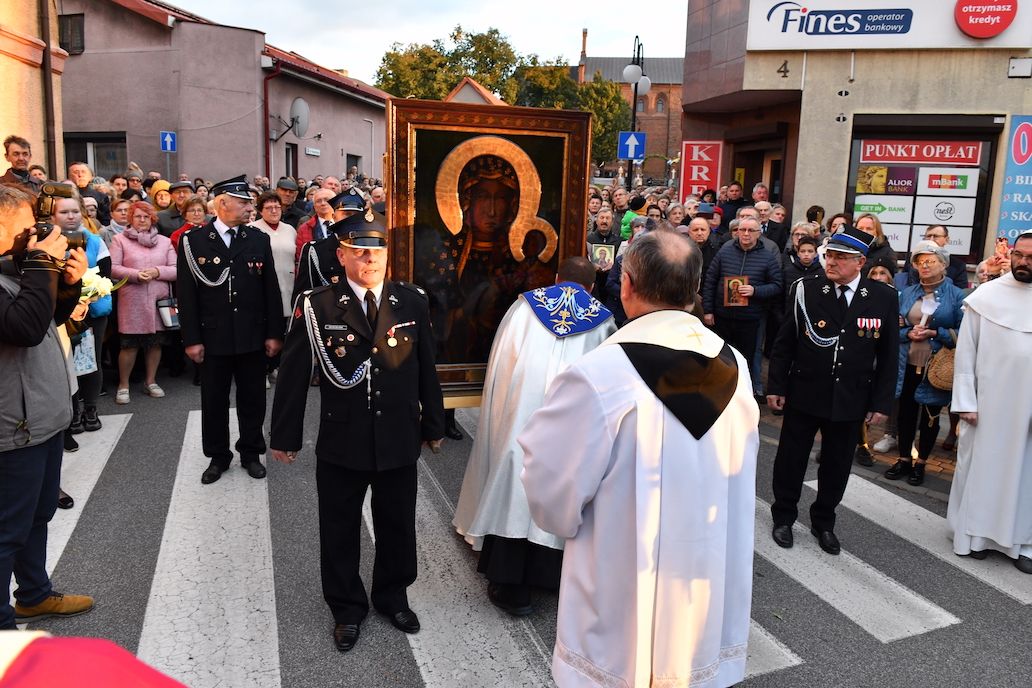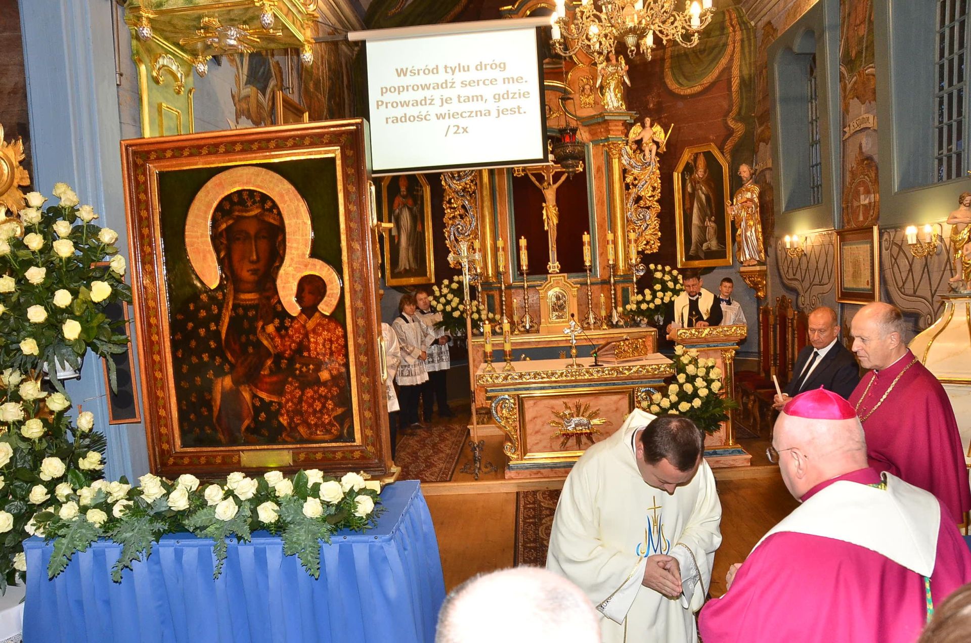 W poniedziałkowe popołudnie. o godz. 16.45 liczna rzesza wiernych zebrała się w sanktuarium, by uczestniczyć w modlitewnym nabożeństwie oczekiwania. Tuż przed godziną 17.15 ze świątyni wyruszyła procesja, aby na granicy parafii oczekiwać na Maryję. Po powitaniu i ucałowaniu Obrazu przez księdza biskupa i ojca proboszcza Krzysztofa Tarnowskiego, ks. Ireneusz Mrowicki, proboszcz parafii Wniebowzięcia NMP przekazał o. Krzysztofowi Ewangeliarz.