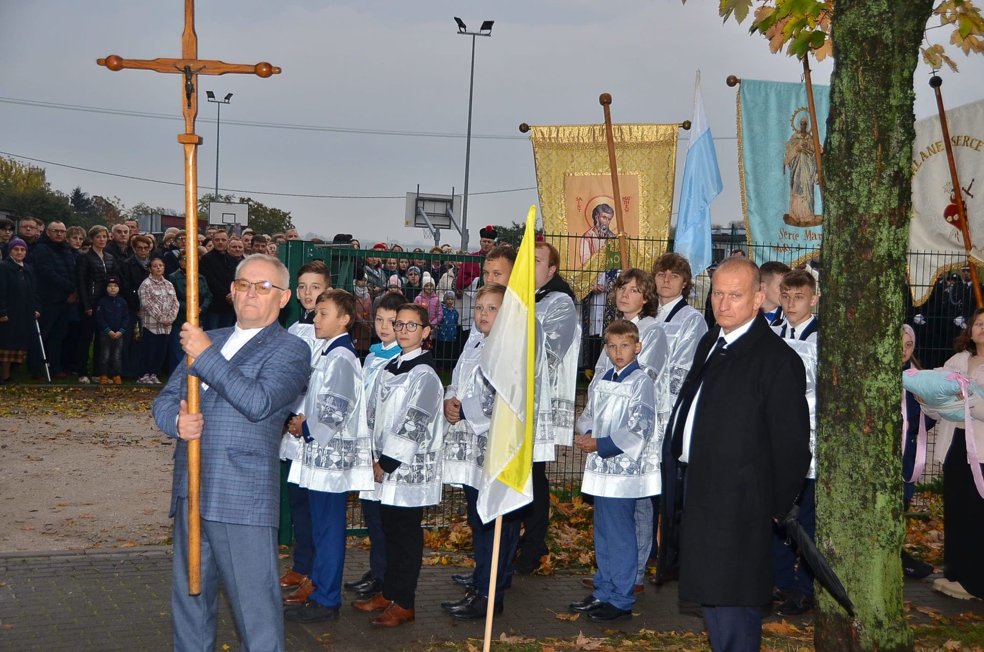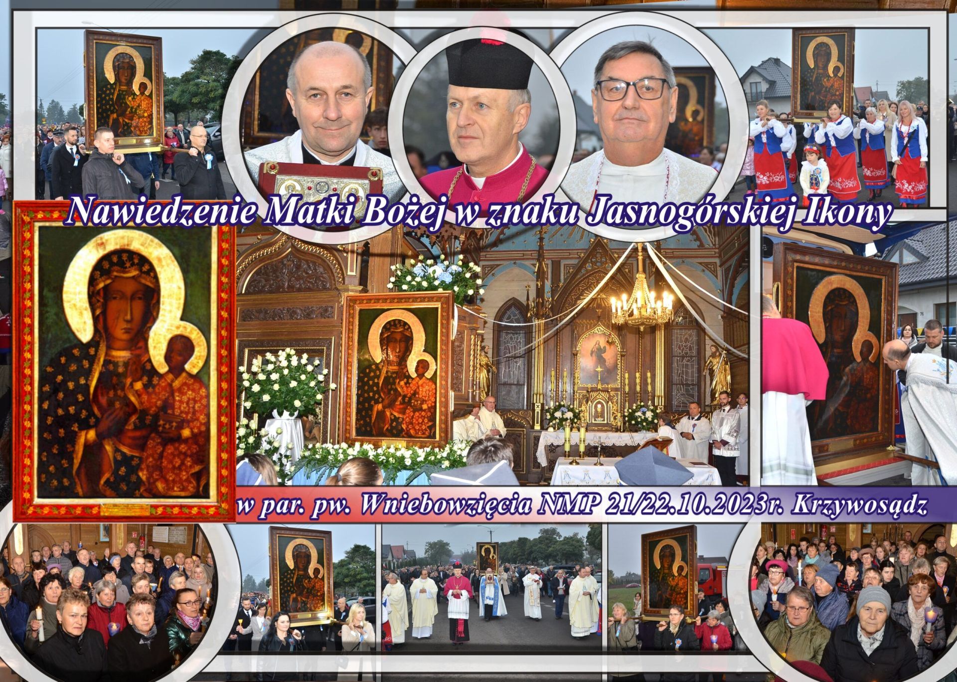 O godzinie 16 rozpoczęła się Msza święta na zakończenie nawiedzenia przez Matkę Bożą w naszej parafii pod przewodnictwem ks. Biskupa Krzysztofa Wętkowskiego, który także wygłosił homilię. Wspólnota parafialna z radością w sercu podziękowała Maryi, Matce i Królowej za to wyjątkowe, ubogacające duchowo spotkanie. Był to niezwykle ważny czas modlitwy, refleksji, a także ożywienia wiary. Obraz Matki Jasnogórskiej na ramionach strażaków z OSP w Krzywosądzy został worszaku procesyjnym zaniesiony do samochodu – kaplicy. W towarzystwie wozów bojowych jednostek OSP, Ikona Jasnogórska opuściła nasza parafię, by udać się do sąsiedniej parafii Sędzin.