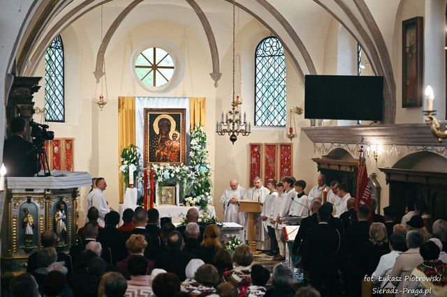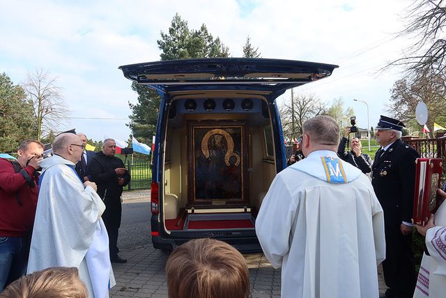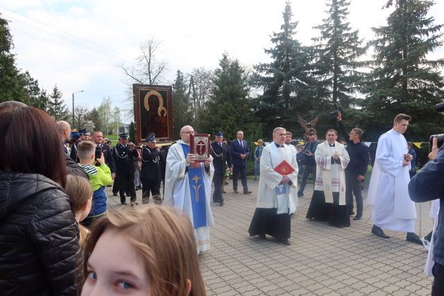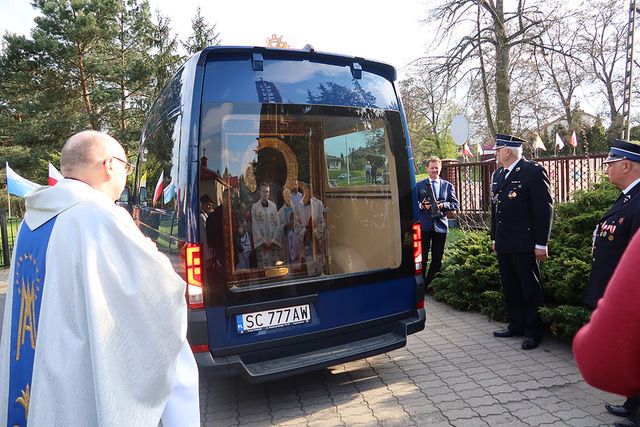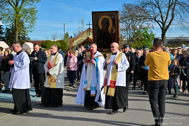 Po zakończonych Misjach Świętych, które prowadzili ojcowie redemptoryści: Zbigniew Podlecki CSsR i Jan Ćwikowski CSsR, do Sanktuarium Matki Bożej Księżnej Sieradzkiej przybył Obraz Pani Jasnogórskiej ok. godziny 17.30. W bardzo licznym gronie wiernych oraz przybyłych księży, Ikonę Czarnej Madonny przywitali ks. bp Stanisław Gębicki oraz ks. prał. Grzegorz Drzewiecki. Następnie w asyście prowadzonej przez służbę liturgiczną, delegacje niosące sztandary, chorągwie, feretrony oraz druhów strażaków Obraz został wprowadzony do wnętrza świątyni.