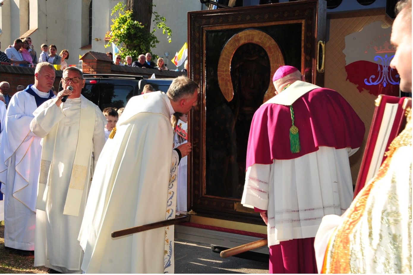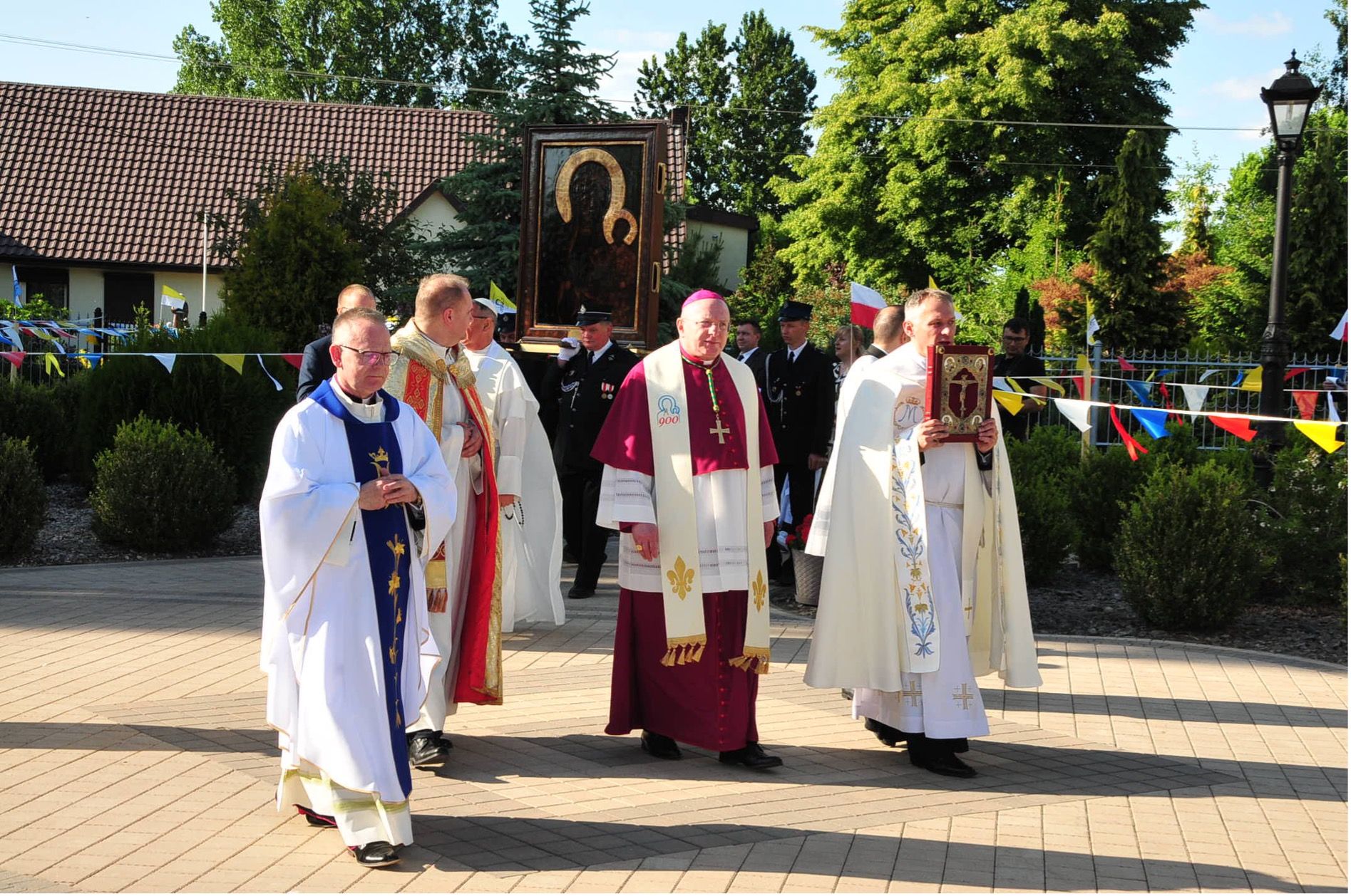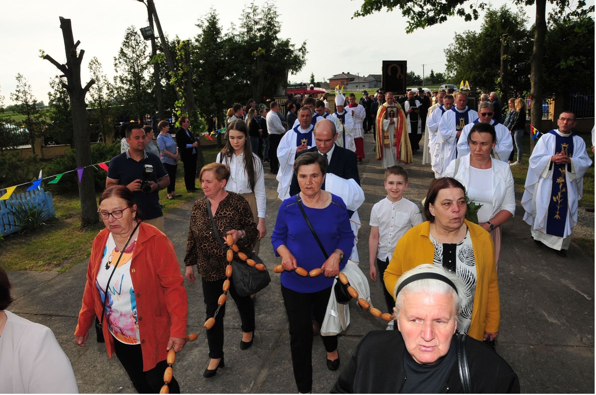 Po duchowym przygotowaniu we wtorek 30 maja o godz. 17.30, z parafii Dzierżawy, przybył obraz Pani Jasnogórskiej. Przy kościele zgromadzili się niemal wszyscy parafianie. Pierwszego powitania po wysunięciu obrazu z samochodu – kaplicy dokonali ks. Bp. Krzysztof Wętkowski i ks. Proboszcz Marek Zieliński, całując ramy obrazu. Po przeniesieniu obrazu przez strażaków do kościoła nastąpiło zapalenie świecy jubileuszowej przez ks. Biskupa oraz odczytanie Ewangelii o nawiedzeniu św. Elżbiety przez ks. Janusza Kowalskiego, kustosza Sanktuarium narodzin i chrztu św. Faustyny w Świnicach Warckich. Ks. Dziekan Andrzej Ziemieśkiewicz odczytał z kolei telegram od Stolicy Apostolskiej. Następnie rozpoczęły się powitania: przez ks. Proboszcza, rodzinę, młodzież i dzieci. Centralny punkt tej popołudniowej liturgii stanowiła msza święta, której przewodniczył pasterz diecezji ks. Bp. Krzysztof Wętkowski, a koncelebrowali wszyscy księża z dekanatu oraz księża goście. Ks. Biskup wygłosił również słowo Boże zachęcając do osobistego spotkania z Maryją podczas modlitwy.