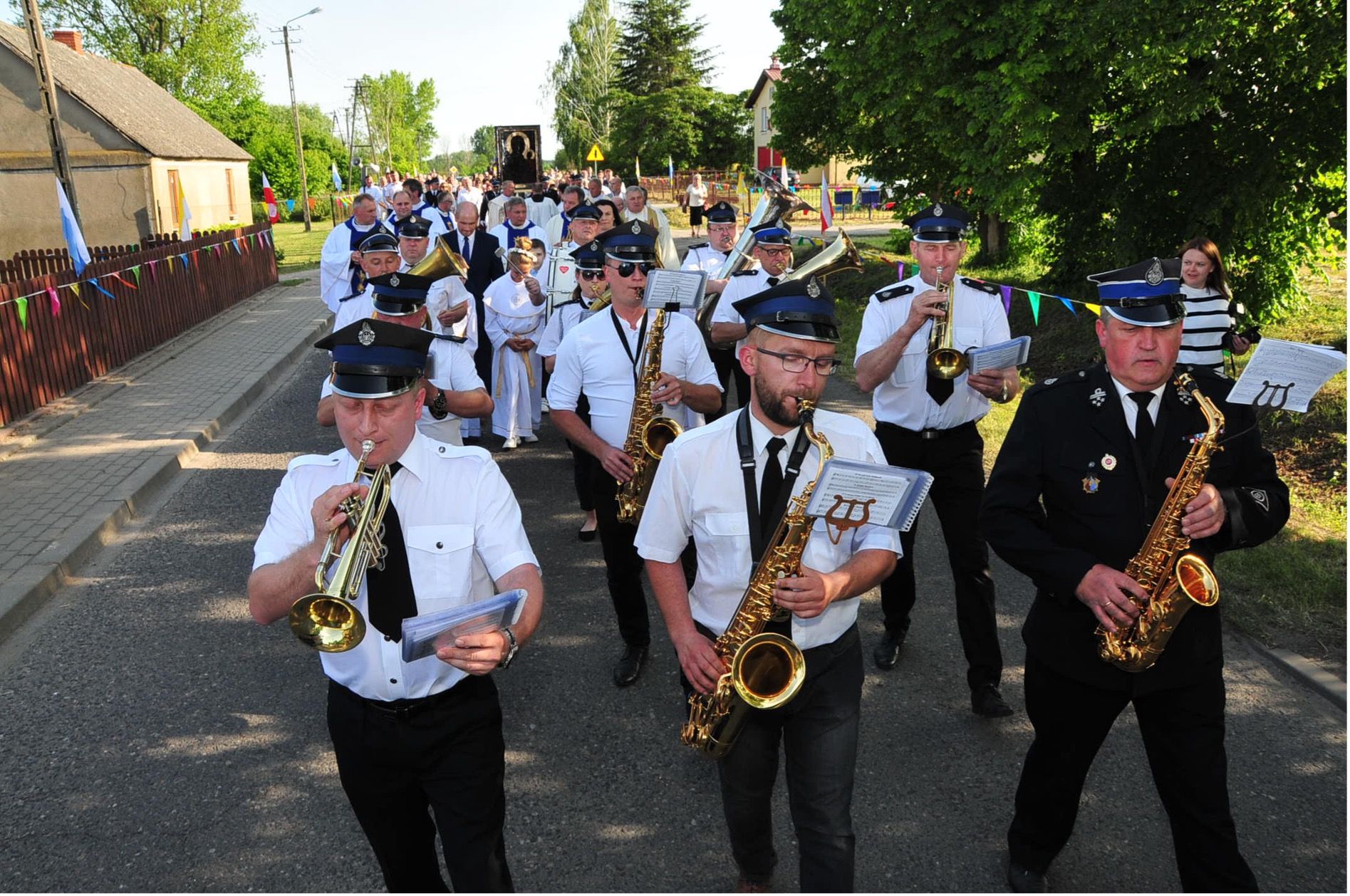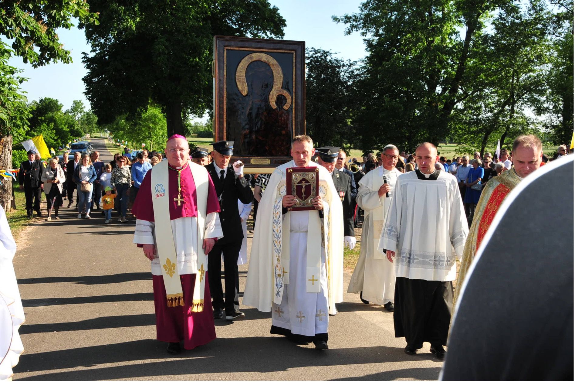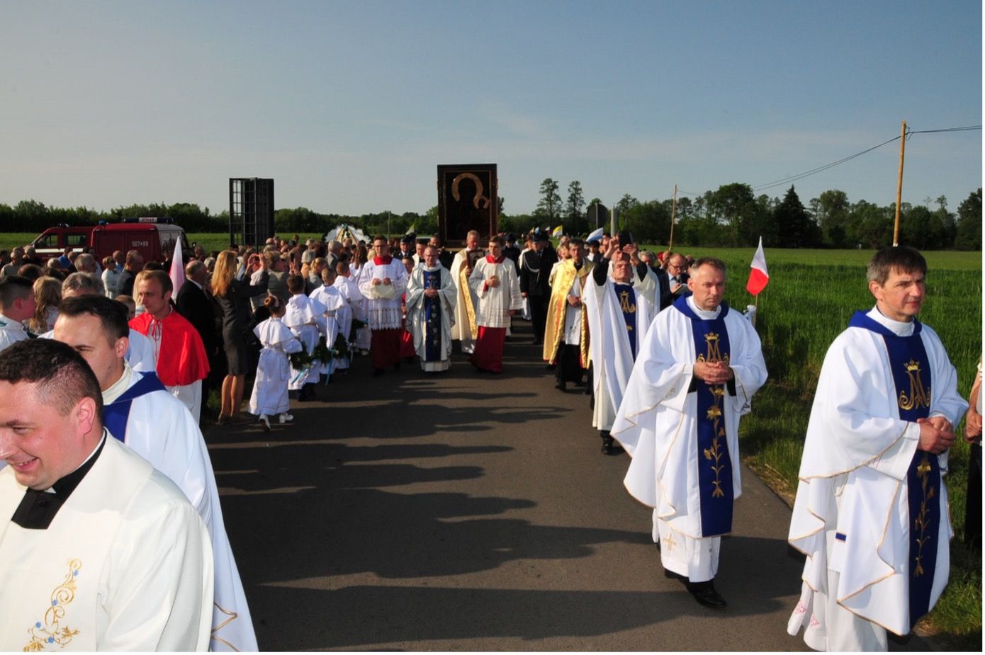 Po duchowym przygotowaniu we wtorek 30 maja o godz. 17.30, z parafii Dzierżawy, przybył obraz Pani Jasnogórskiej. Przy kościele zgromadzili się niemal wszyscy parafianie. Pierwszego powitania po wysunięciu obrazu z samochodu – kaplicy dokonali ks. Bp. Krzysztof Wętkowski i ks. Proboszcz Marek Zieliński, całując ramy obrazu. Po przeniesieniu obrazu przez strażaków do kościoła nastąpiło zapalenie świecy jubileuszowej przez ks. Biskupa oraz odczytanie Ewangelii o nawiedzeniu św. Elżbiety przez ks. Janusza Kowalskiego, kustosza Sanktuarium narodzin i chrztu św. Faustyny w Świnicach Warckich. Ks. Dziekan Andrzej Ziemieśkiewicz odczytał z kolei telegram od Stolicy Apostolskiej. Następnie rozpoczęły się powitania: przez ks. Proboszcza, rodzinę, młodzież i dzieci. Centralny punkt tej popołudniowej liturgii stanowiła msza święta, której przewodniczył pasterz diecezji ks. Bp. Krzysztof Wętkowski, a koncelebrowali wszyscy księża z dekanatu oraz księża goście. Ks. Biskup wygłosił również słowo Boże zachęcając do osobistego spotkania z Maryją podczas modlitwy.