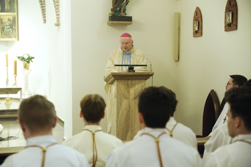 „Bycie uczniem wymaga stałej formacji” - tymi słowami zwrócił się biskup włocławski do grupy ceremoniarzy Diecezji Włocławskiej przeżywającej w sobotę 11 kwietnia swój dzień formacyjny. Spotkanie rozpoczęło się wspólną Eucharystią w kościele seminaryjnym, której przewodniczył biskup Krzysztof Wętkowski. Nawiązując do ewangelii z dnia Ksiądz Biskup wskazał na trudności w wierze apostołów, którzy pomimo czytelnych znaków od Jezusa nie potrafili przyjąć prawdy o Zmartwychwstaniu. „Zbawiciel mimo tych ograniczeń nie rezygnuje z nich ale tym bardziej posyła ich z misją głoszenia światu Ewangelii. To wezwanie Zbawiciela jest skierowane także do każdego z nas, Jezus Chrystus, widząc nasze ludzkie słabości nie zniechęca się aby czynić z nas misjonarzy w naszych środowiskach” – kontynuował biskup włocławski.