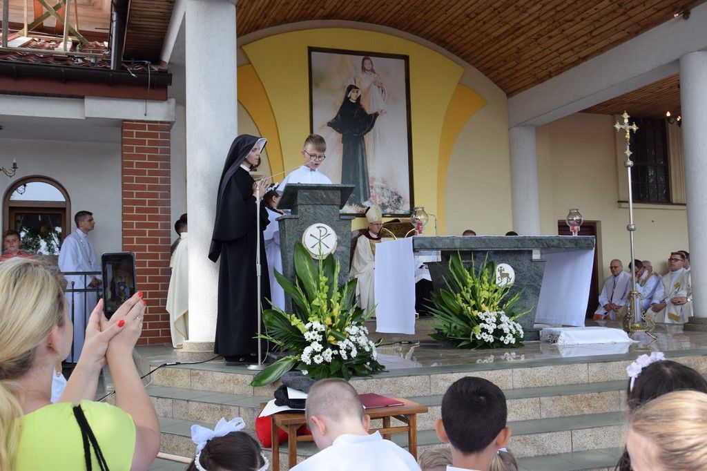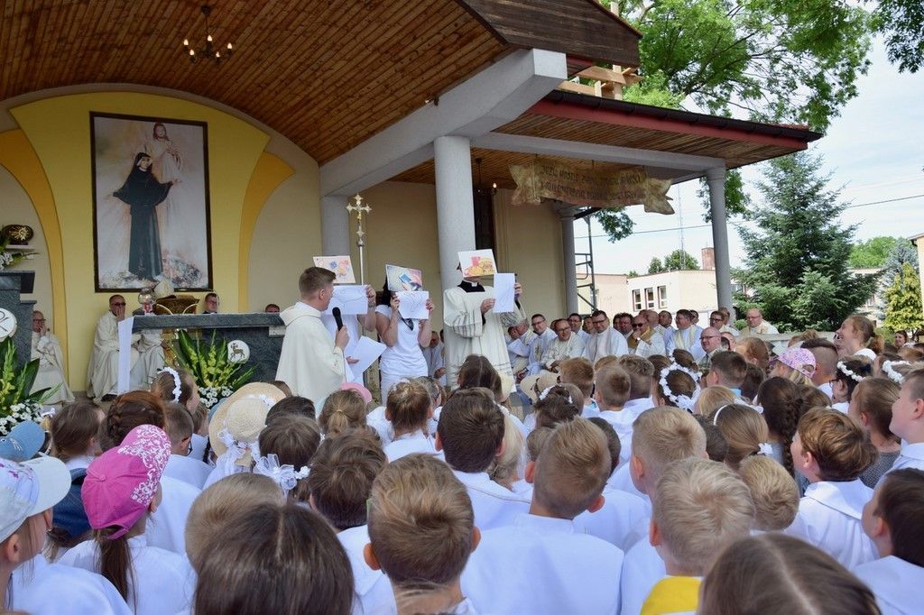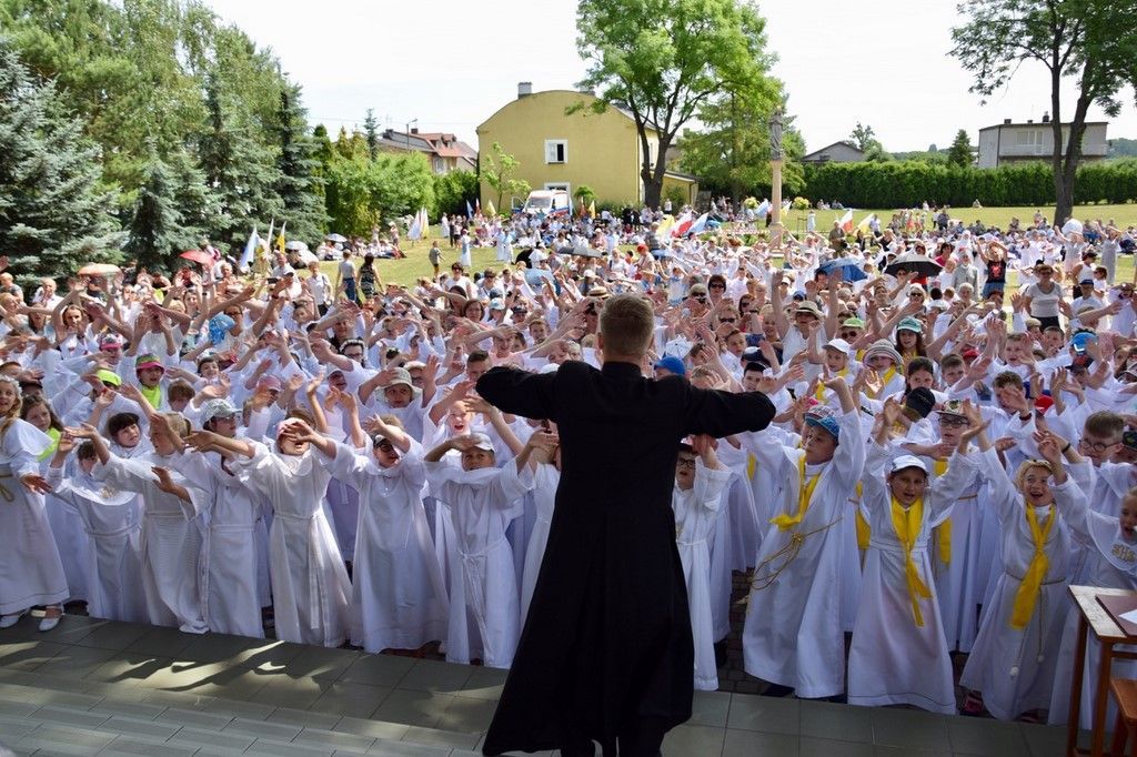 Optymizm i energia dzieci pierwszokomunijnych ukazała się po przybyciu do ołtarza polowego przy świątyni. Tam, przy akompaniamencie zespołu „Jordan” ze Zduńskiej Woli i wspólnej zabawie, animowanej przez ks. prał. Michała Krygiera, dyrektora Wydziału Duszpasterstwa Ogólnego Kurii we Włocławku, dzieci okazywały swoją wdzięczność i radość ogarniające ich młode serca.