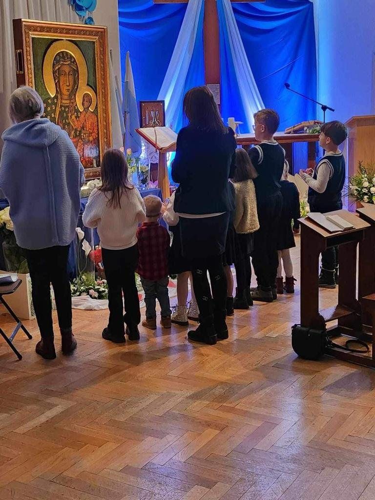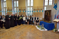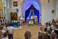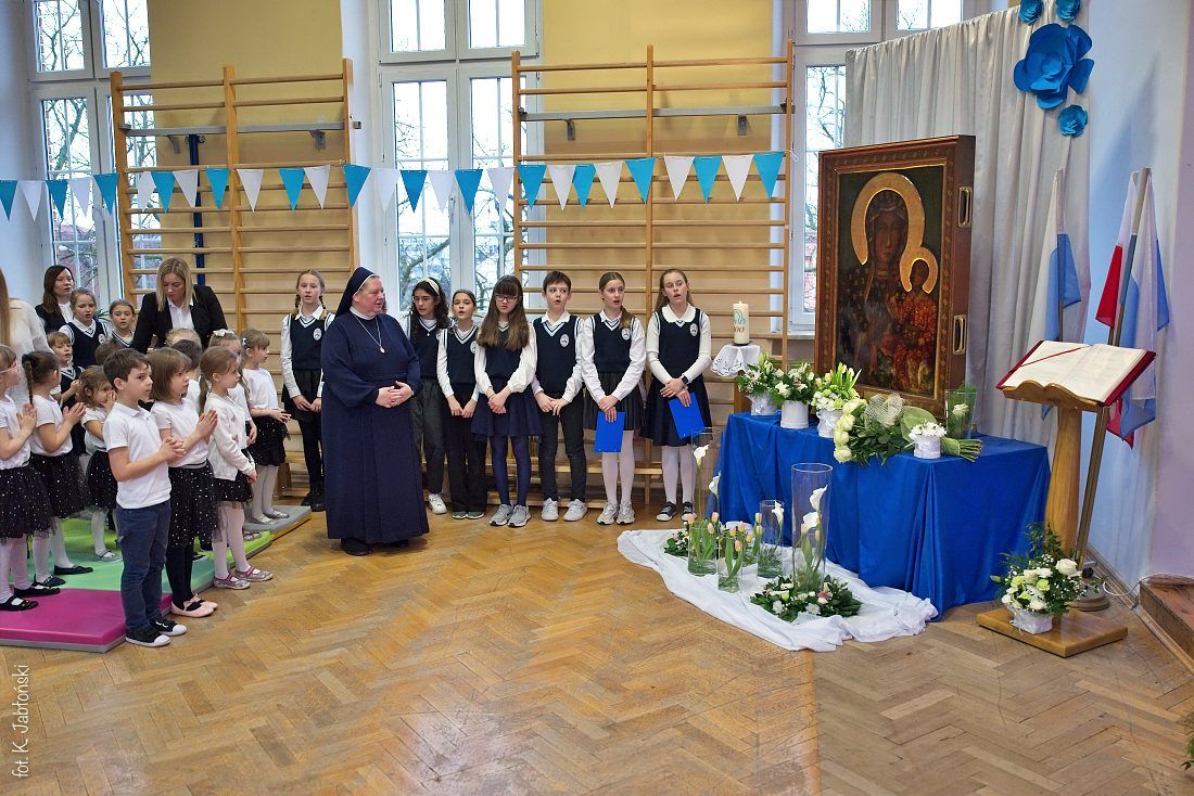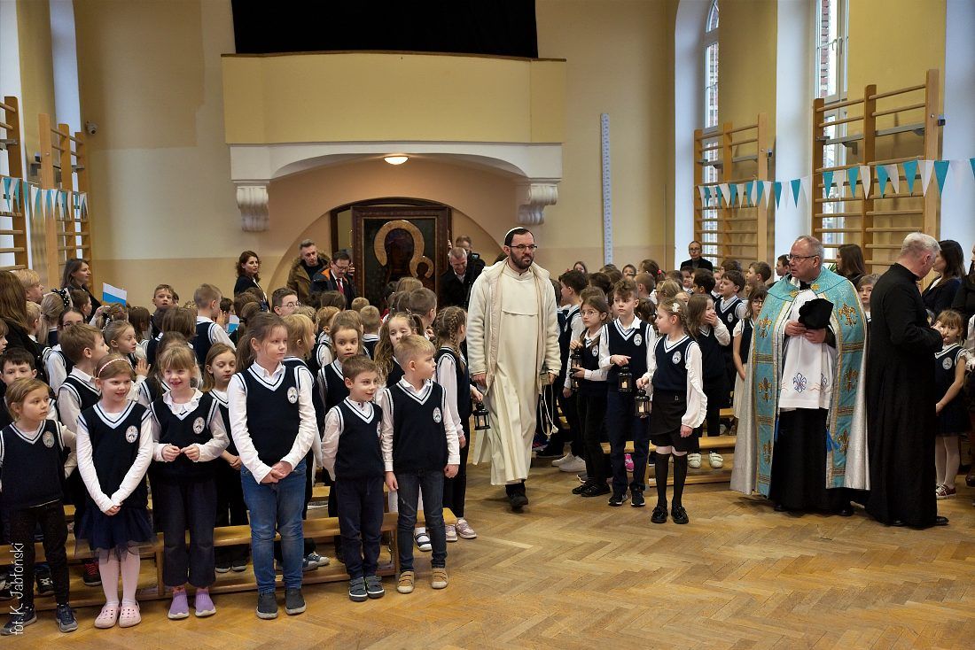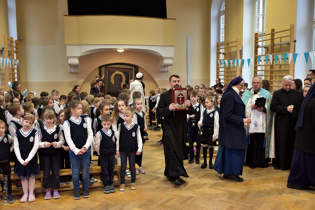 Przedszkolaki zwychowawczyniami wraz zks.dyrektorem Jackiem Kędzierskim orazks.wicedyrektorem Sebastianem Tomczakiem uroczyście przywitali Ikonę przedbudynkiem szkoły, bywspólnie udać się nasalę gimnastyczną, gdzie zniecierpliwością czekali już pozostali uczniowie, nauczyciele orazpracownicy Małego Długosza. Sala taażdopiątku stała się miejscem modlitwy orazduchowych uroczystości.