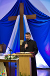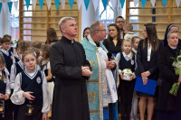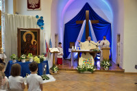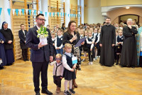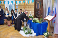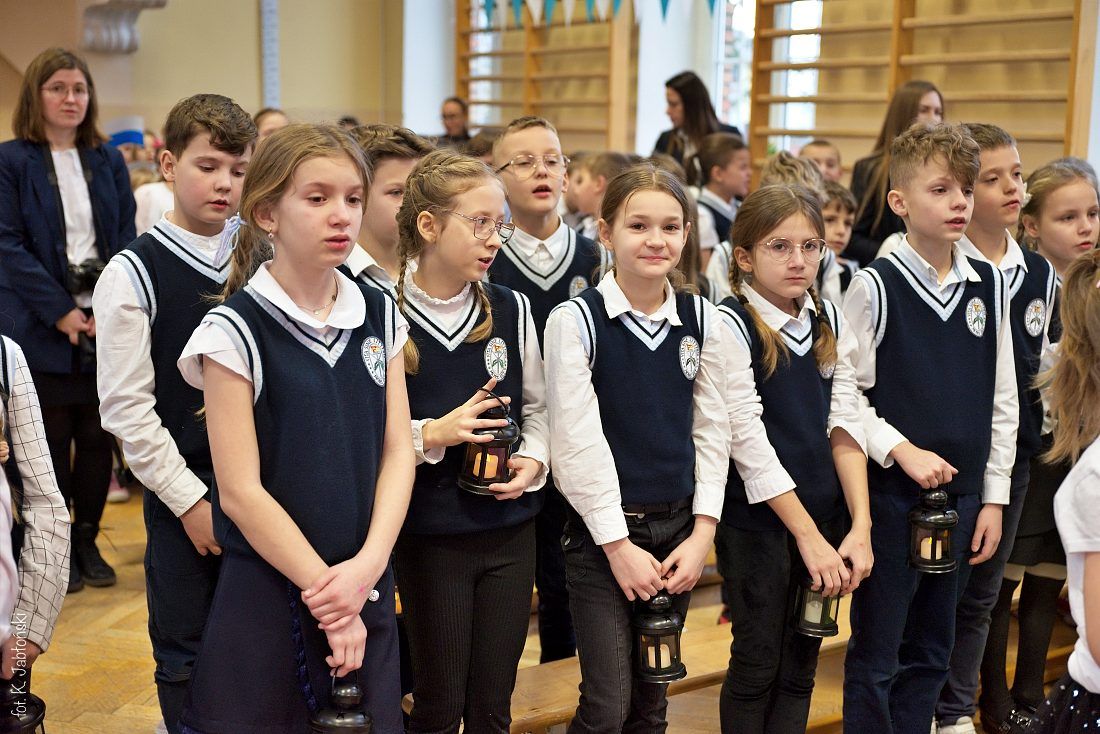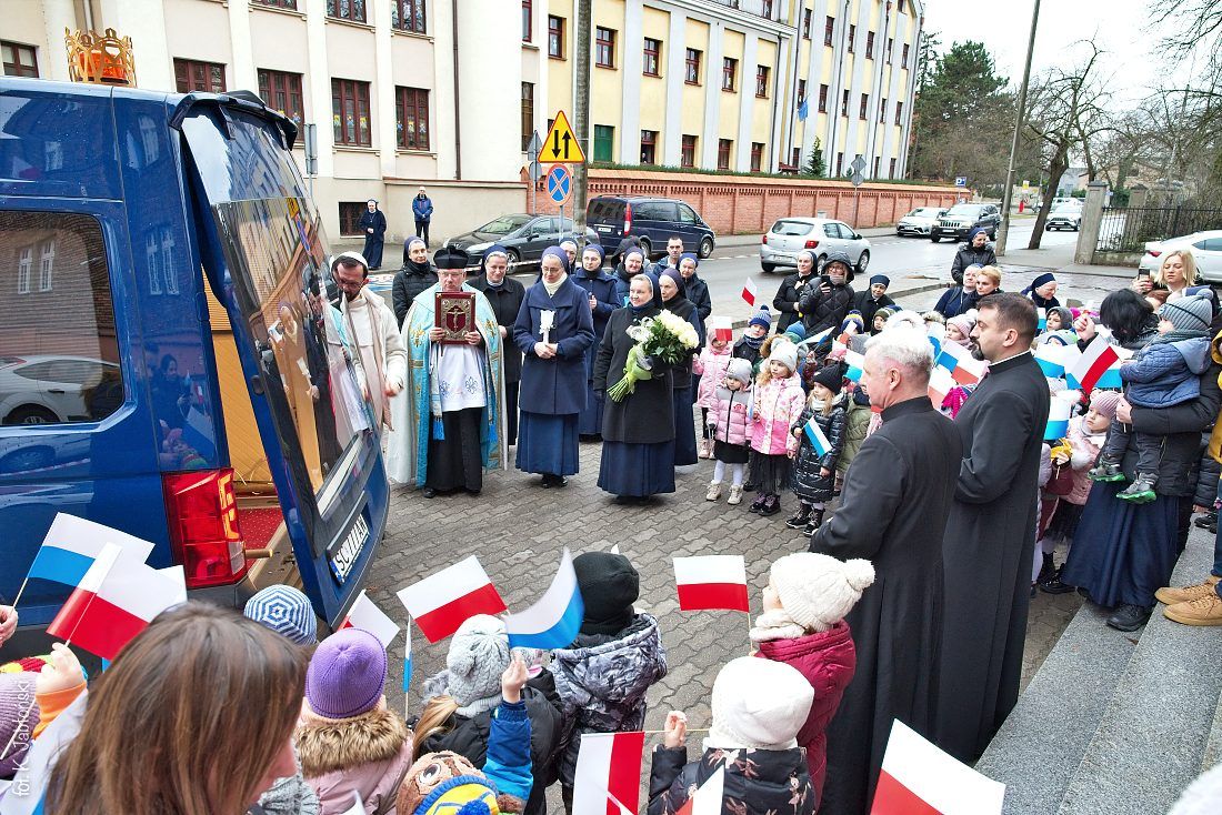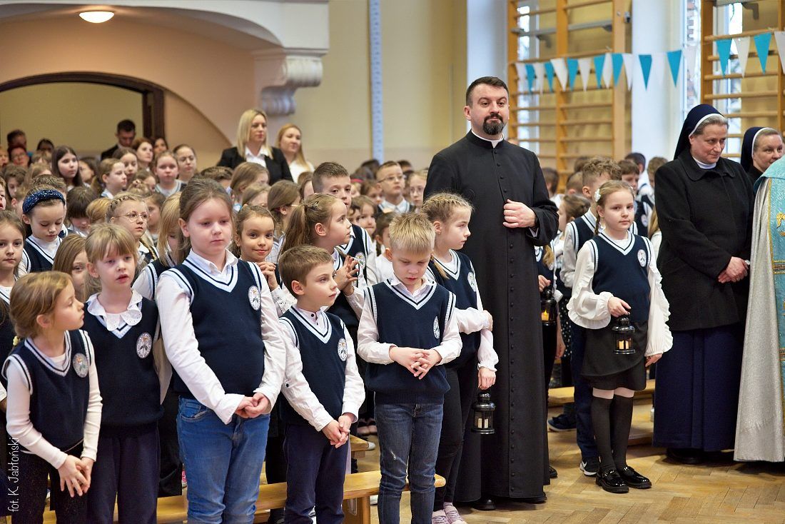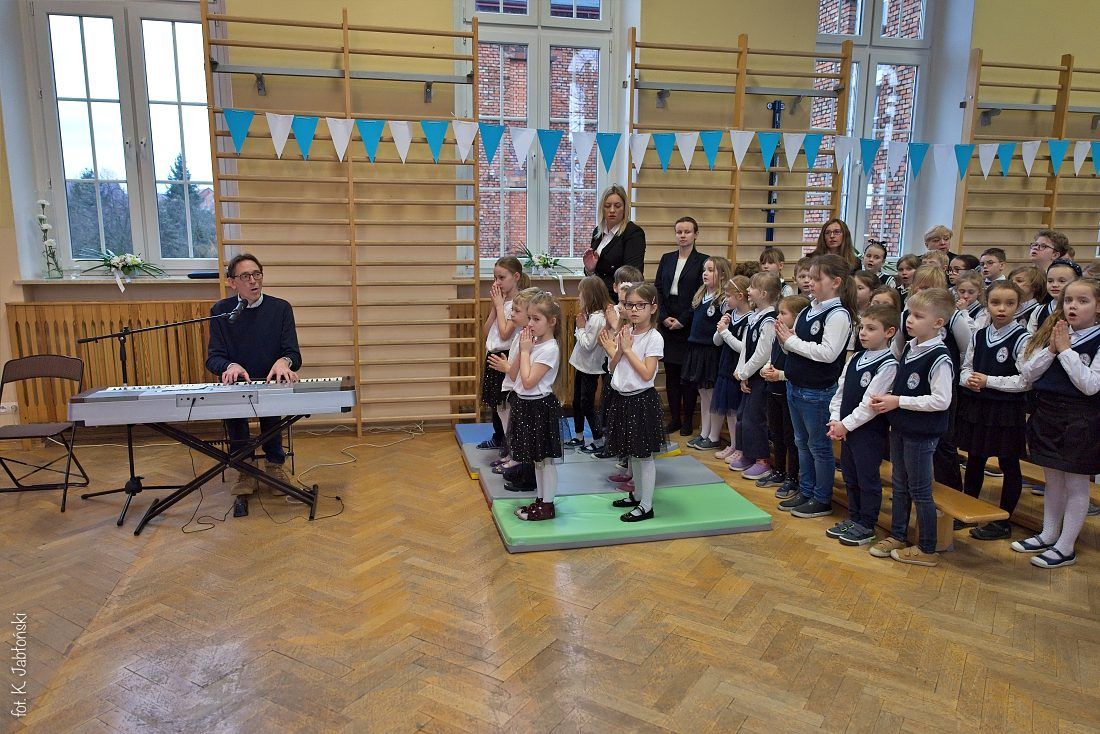 Przedszkolaki zwychowawczyniami wraz zks.dyrektorem Jackiem Kędzierskim orazks.wicedyrektorem Sebastianem Tomczakiem uroczyście przywitali Ikonę przedbudynkiem szkoły, bywspólnie udać się nasalę gimnastyczną, gdzie zniecierpliwością czekali już pozostali uczniowie, nauczyciele orazpracownicy Małego Długosza. Sala taażdopiątku stała się miejscem modlitwy orazduchowych uroczystości.