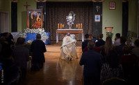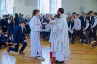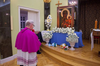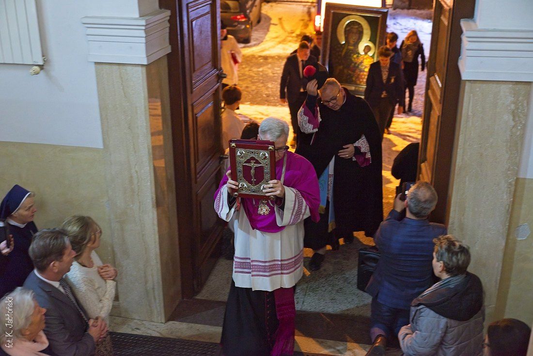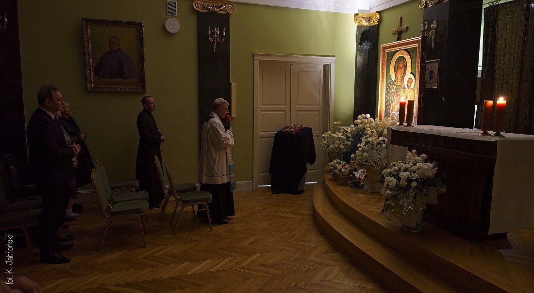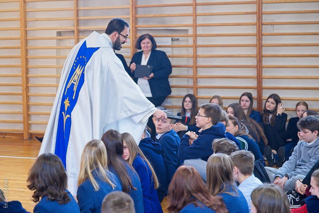 Jedno z wykonanych przez siebie dzieł artysta przywiózł z sobą do naszej szkoły – Monstrancję Świętej Rodziny. W niej został umieszczony Najświętszy Sakrament na czas adoracji przy Ikonie Matki Bożej. Po modlitwie w ciszy, która trwała do godz. 21.00, zebrani w szkolnej auli, wraz z młodzieżą z internatu, odśpiewali Apel Jasnogórski. Po nim Matka Boża przy śpiewie pieśni została przeniesiona do szkolnej kaplicy pw. Św. Kazimierza Królewicza, gdzie będzie przebywała do piątku 8 grudnia.