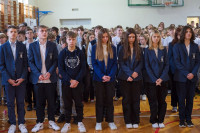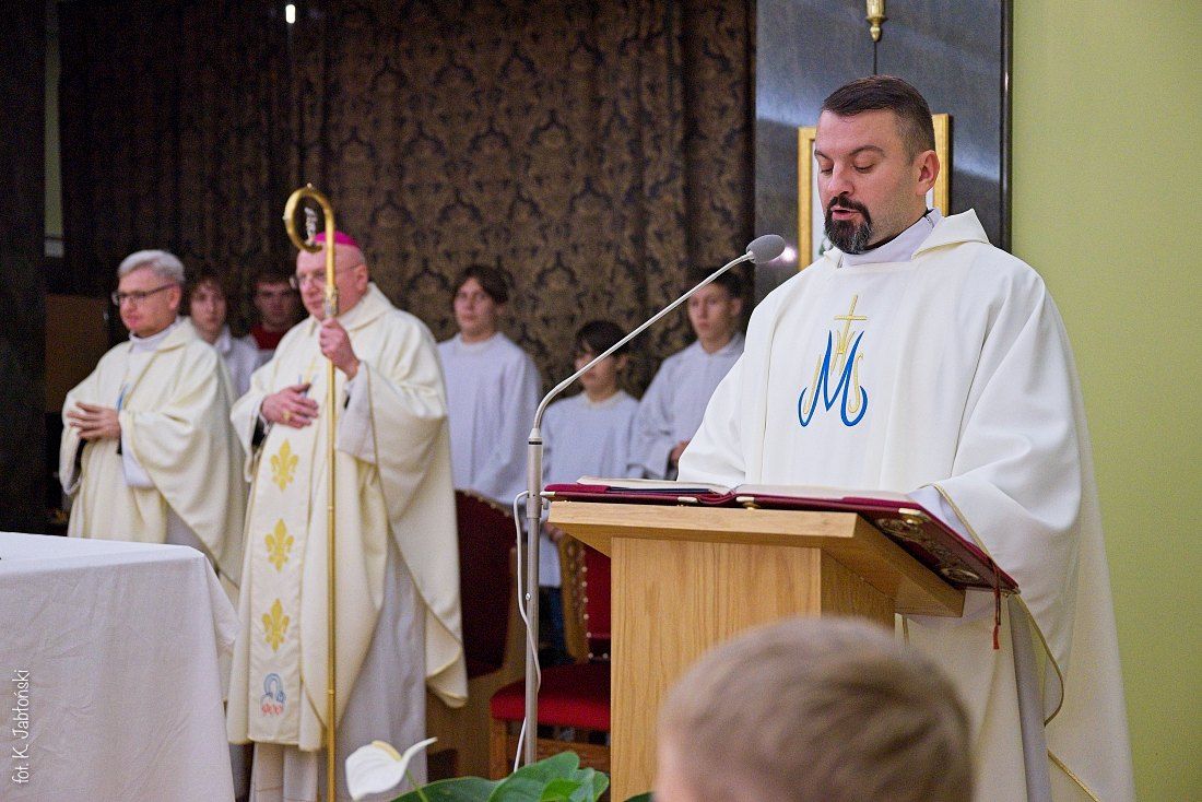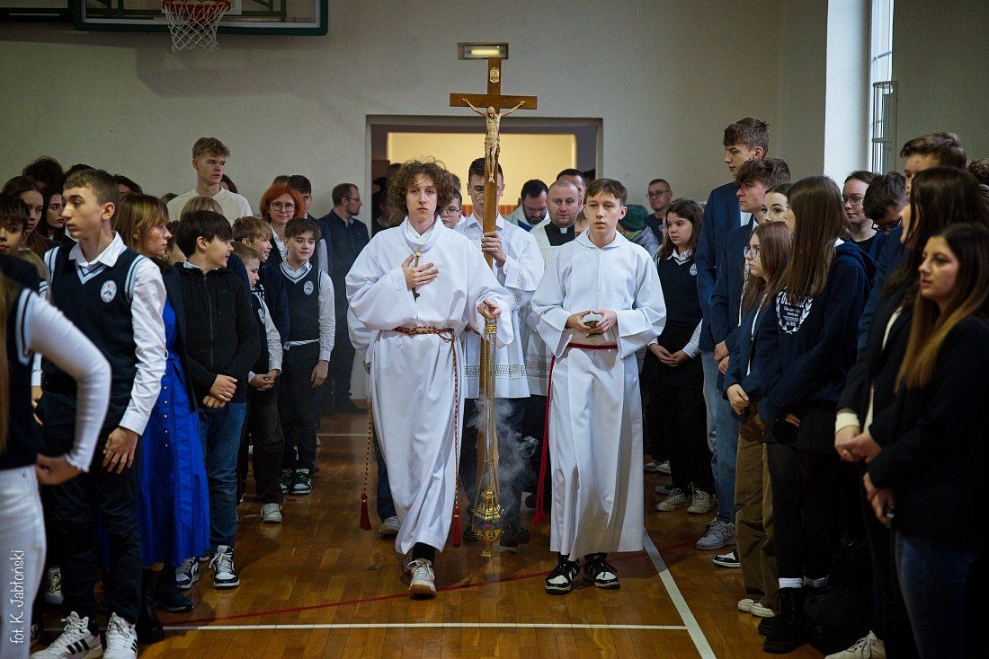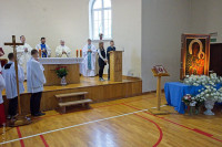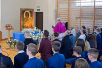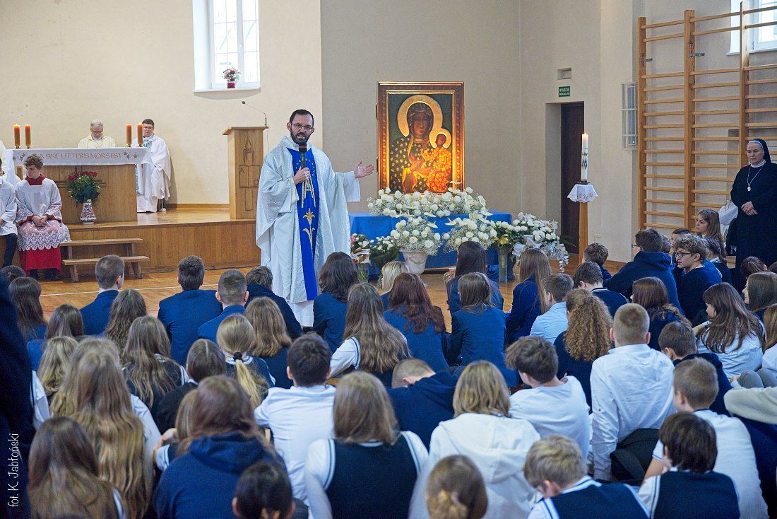 Po tym przywitaniu rozpoczęła się Eucharystia, której przewodniczył ks. bp Krzysztof Wętkowski. W wygłoszonym kazaniu nakreślił on ideę peregrynacji Ikony Matki Bożej, która zrodziła się w trudnych czasach komunizmu z inspiracji Prymasa Stefana Wyszyńskiego, a była odpowiedzią na wołanie narodu: „Matko, przyjdź do nas”. Kaznodzieja przypomniał, że od roku 1957 Matka Boża w Jasnogórskim Wizerunku nieustannie ( już po raz drugi) nawiedza polskie diecezje i parafie. Przywołał również dramatyczne chwile, kiedy obraz był „aresztowany” i symbolicznie wędrowały same ramy. Ksiądz Biskup, odnosząc się do treści odczytanego listu papieża Franciszka, podkreślił wymiar duchowy wizyty Matki Bożej w obecnym czasie nawiedzenia – aby wierni mogli pogłębiać swoją wiarę i religijność poprzez czuwanie i modlitwę. Zwracając się do uczniów, wskazał, jak ważna jest umiejętność wejścia w ciszę, medytację, odcięcie od hałasu i natłoku internetowych informacji we współczesnym świecie. W przyjęciu takiej postawy wiary i zasłuchania w słowo Boże nauczycielką jest Maryja, która jako pierwsza pobierałalekcje w szkole Chrystusa. Podsumowując swoje rozważania, Ksiądz Biskup zachęcił, aby w pełni, owocnie skorzystać z tego wyjątkowego czasu kilku dni nawiedzenia, gdyż to dla społeczności Długosza czas łaski.