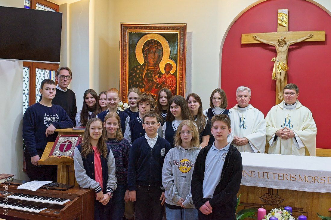 Uroczystość powitania Matki Bożej w budynku przy ul. Łęgskiej nastąpiła w niedzielne popołudnie 3 grudnia 2023 roku. O godzinie 17.30 w szkolnej auli rozpoczęło się nabożeństwo oczekiwania połączone z modlitwą różańcową. Koło godz. 18.00 pojazd z Obrazem Matki Bożej dotarł z Czernikowa do Włocławka i zajechał przed budynek naszej szkoły. Zabrzmiały fanfary i oczom zebranych przed wejściem do budynku ukazała się Ikona Czarnej Madonny, którą na powitanie z szacunkiem ucałowali ks. bp Krzysztof Wętkowski oraz ks. dyrektor Jacek Kędzierski, a młodzież z internatu na czele procesji, przy śpiewie pieśni uroczyście wniosła do szkolnej auli. Obraz Madonny Jasnogórskiej oraz Ewangeliarz ustawiono w specjalnie przygotowanym, udekorowanym białymi kwiatami i podświetlonym miejscu. Po odśpiewaniu pieśni, specjalnie napisanej na nawiedzenie Matki Bożej w diecezji, przedstawiciele parafii Czernikowo z jej ks. proboszczem pożegnali Maryję, a powitały Ją delegacje Długosza: ks. dyr. Jacek Kędzierski, reprezentacja rodzin i młodzieży internatu. Następnie ks. Sebastian Tomczak odczytał fragment Ewangelii św. Łukasza o nawiedzeniu św. Elżbiety, przy którym radosne „Magnificat” Maryi zostało wyśpiewane przez tłum wiernych zgromadzonych w auli: rodziców, dziadków, uczniów, nauczycieli…